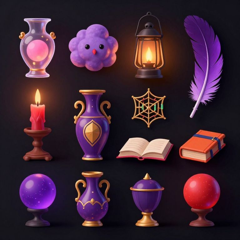 The image presents a collection of ten magical items arranged in a grid-like pattern against a dark background. Starting from the top left, there is a glowing, translucent vase with a pink sphere inside, followed by a red candle on a wooden stand. Next to the candle is a whimsical, purple, cloud-like creature with a red beak. Moving right, there is a lantern with a warm flame, casting a soft glow. Below the lantern, a purple vase with a gold emblem stands out, accompanied by a golden, web-like structure with green candles. To the right of the web, a purple feather with wings extends upwards. Below the feather, an open book with a red spine lies flat, and to its right, a closed, orange book with blue straps is positioned. The bottom row features a purple, spherical object on a stand, a purple vase with a gold handle, and a red orb on a pedestal. The overall composition is balanced, with each item carefully placed to create a harmonious arrangement of magical artifacts.