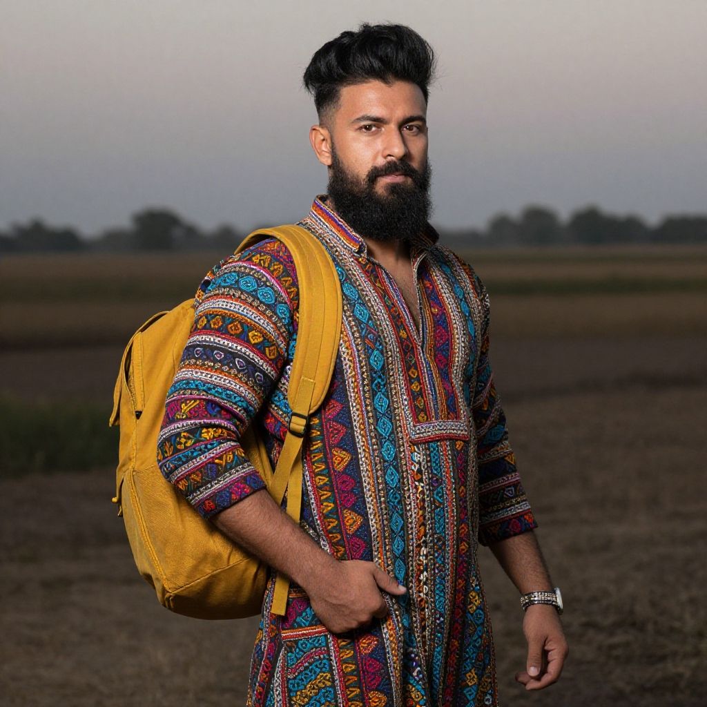 A man with a thick beard and styled black hair stands confidently in a rural field during twilight. He is dressed in a vibrant, intricately embroidered traditional garment with colorful patterns, complemented by a mustard-yellow backpack, blending cultural heritage with modern outdoor elements.