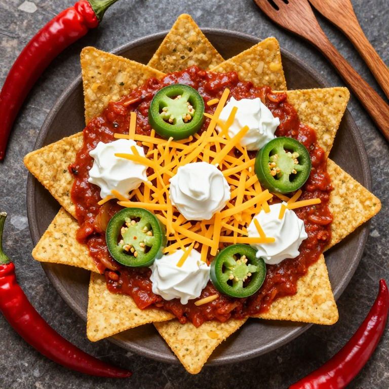 Top-down view of nachored nachos layered with spicy red enchilada sauce, fresh green jalapenos, sour cream dollops, and shredded cheese, styled with rustic props like chili peppers and wooden utensils, capturing a warm, hearty meal vibe.