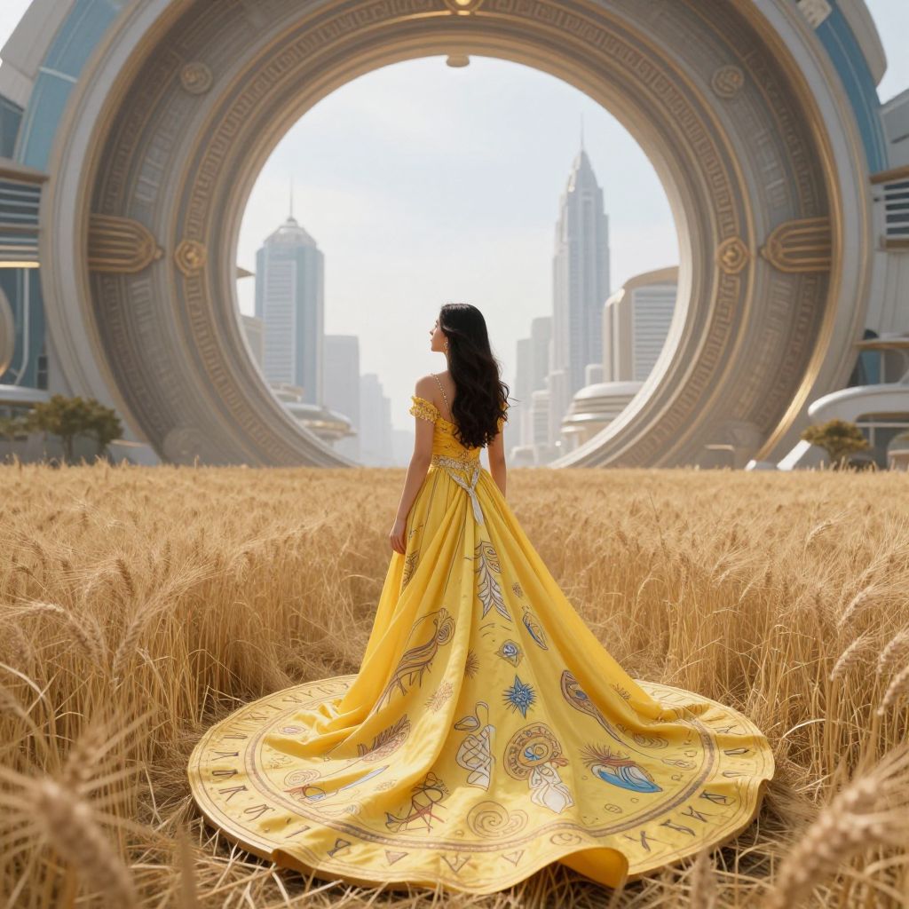 Photograph of a woman with long, wavy black hair standing in a golden wheat field, viewed from behind. She wears a flowing, bright yellow dress with intricate blue and white patterns and a long, circular train. She stands centered in the image, with a large, circular futuristic structure in the background, framed by tall skyscrapers. The structure has metallic and blue accents, with inscriptions along its edge. The bright daylight creates a contrast between the golden wheat and the modern cityscape. The scene combines natural and futuristic elements, creating a striking visual contrast.