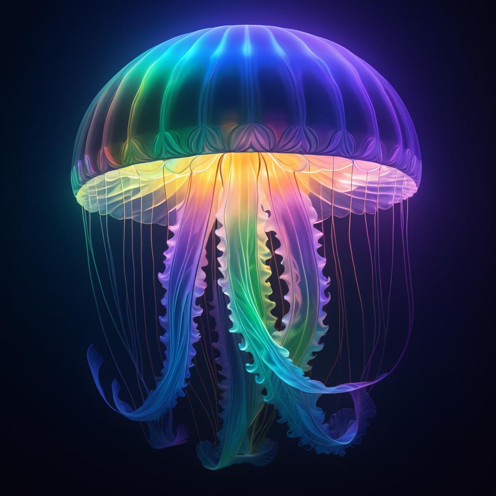 Ultra-realistic digital painting of a glowing jellyfish with intricate details and symmetrical design. The jellyfish is illuminated with volumetric rainbow lighting, featuring vibrant colors transitioning smoothly across its translucent bell and frilled tentacles, set against a dark background.