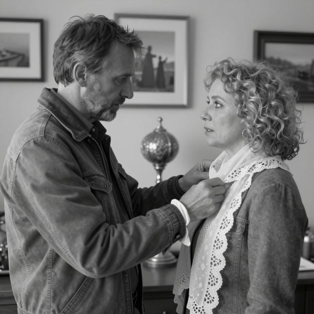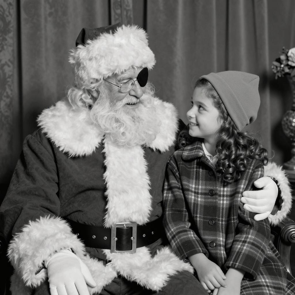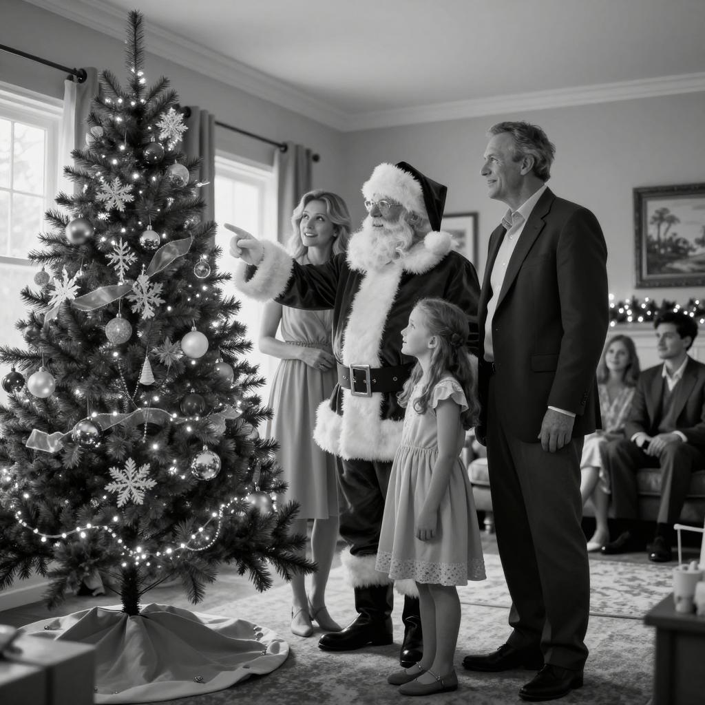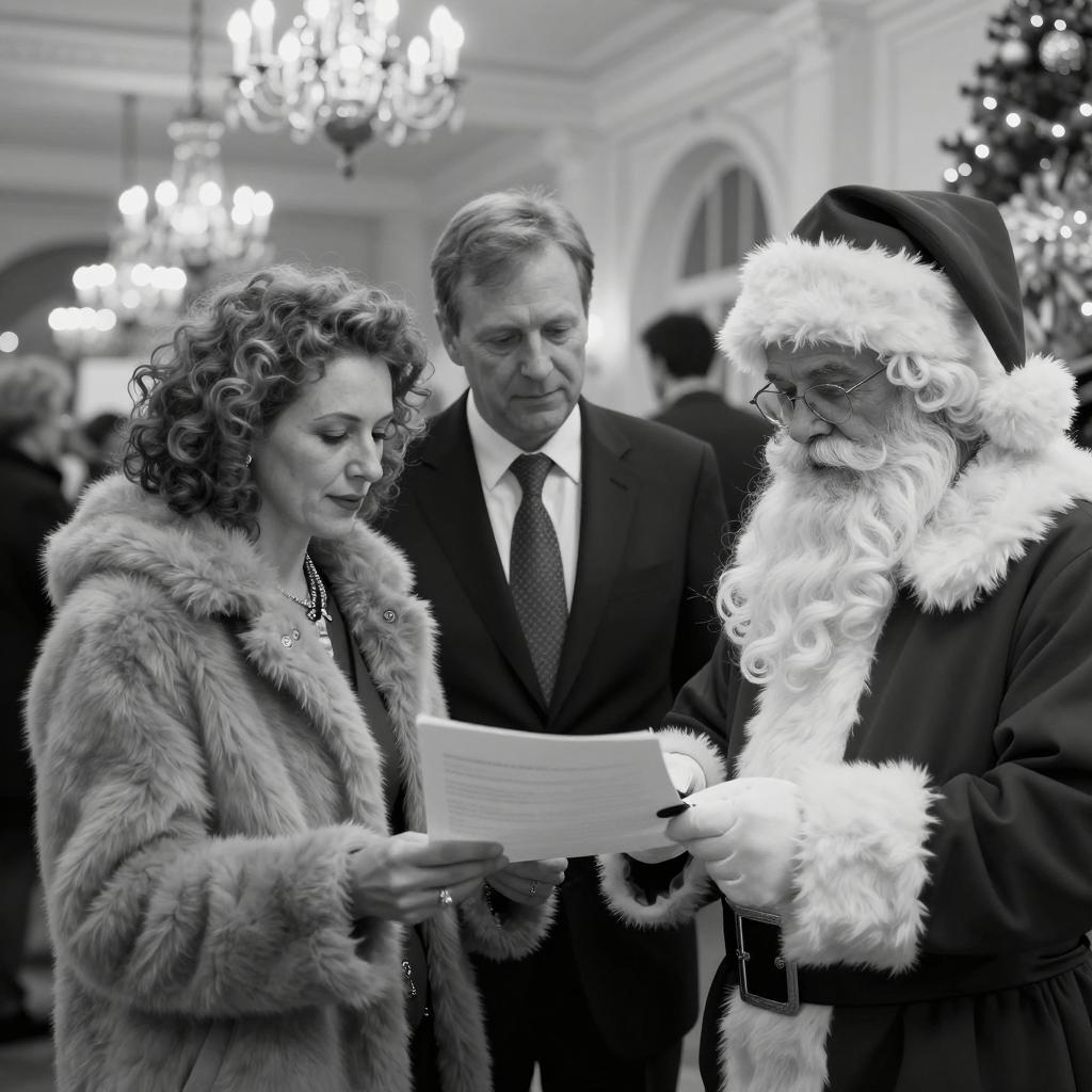 Black and white photograph of three people in a festive setting. A woman with curled hair and a fur coat holds papers, a middle-aged man with short hair and a dark suit stands between her and a bearded Santa Claus. Santa Claus wears a traditional hat and holds a small object. Background includes other people and chandeliers. Santa Claus and woman focus on the papers, man looks down.