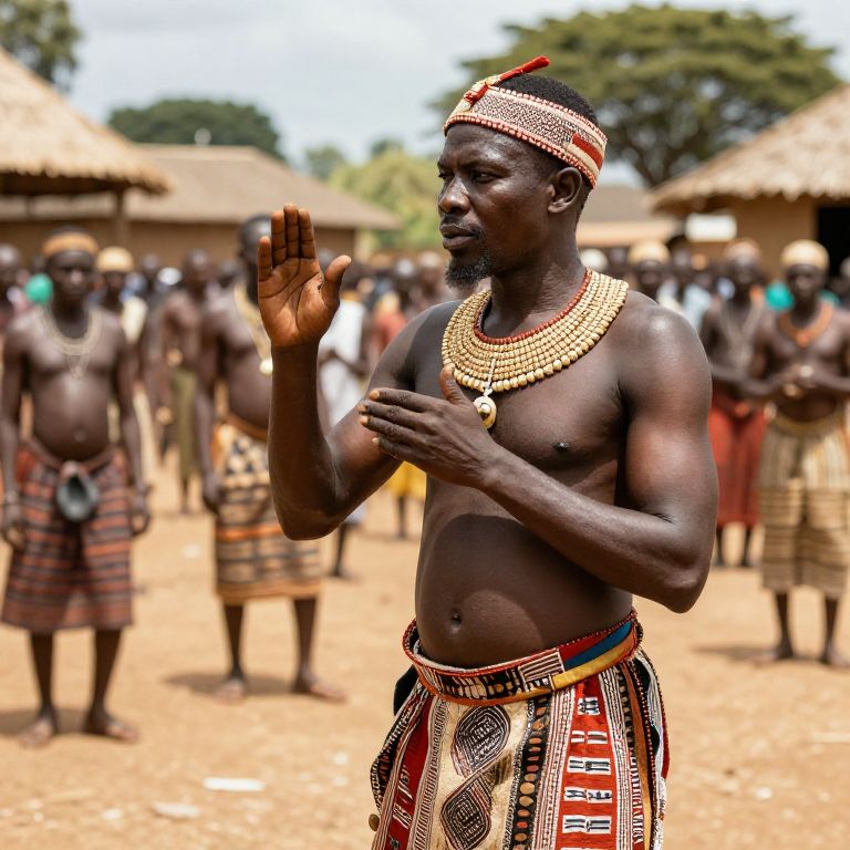 Photograph of a muscular, dark-skinned African man standing outdoors in a village setting. He wears a traditional beaded headband, a gold necklace, and patterned red, black, and white loincloth. His right hand is raised, palm open, while his left hand rests on his chest. Background includes blurred figures of other villagers, thatched-roof huts, and trees under a bright, clear sky. The scene exudes cultural richness and community. The man's expression is calm and focused. The image is vibrant with rich colors and textures, highlighting traditional African attire and culture.