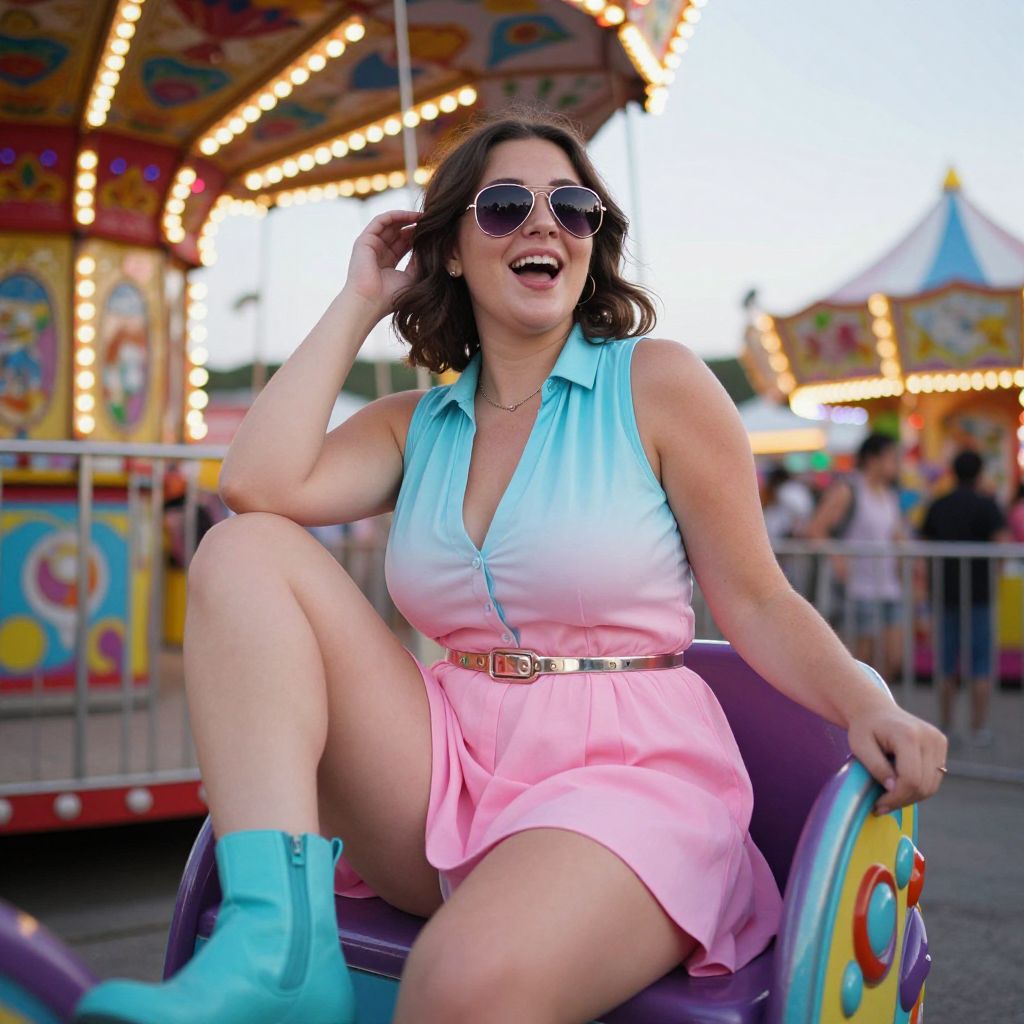 A stocky woman in a sleeveless ombre shirtdress with a gradient from light blue to pink, cinched at the waist with a metallic belt, is enjoying a vibrant evening at a colorful carnival ride. She wears aviator sunglasses and contrasting turquoise ankle boots. Captured in the dreamy style of a Holga camera, she is laughing as she takes a selfie with the dazzling lights of the carnival in the background. Sexy. Pretty face and beаutiful eyes. Big breasts