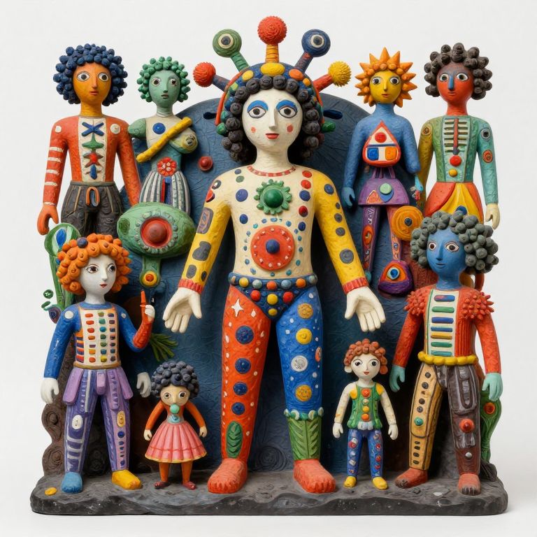 A vibrant, intricately detailed sculpture featuring a central figure surrounded by multiple smaller figures, all adorned with colorful, fantastical designs, reminiscent of the works of Walter Molino, Friedensreich Hundertwasser, and Mark Ryden.