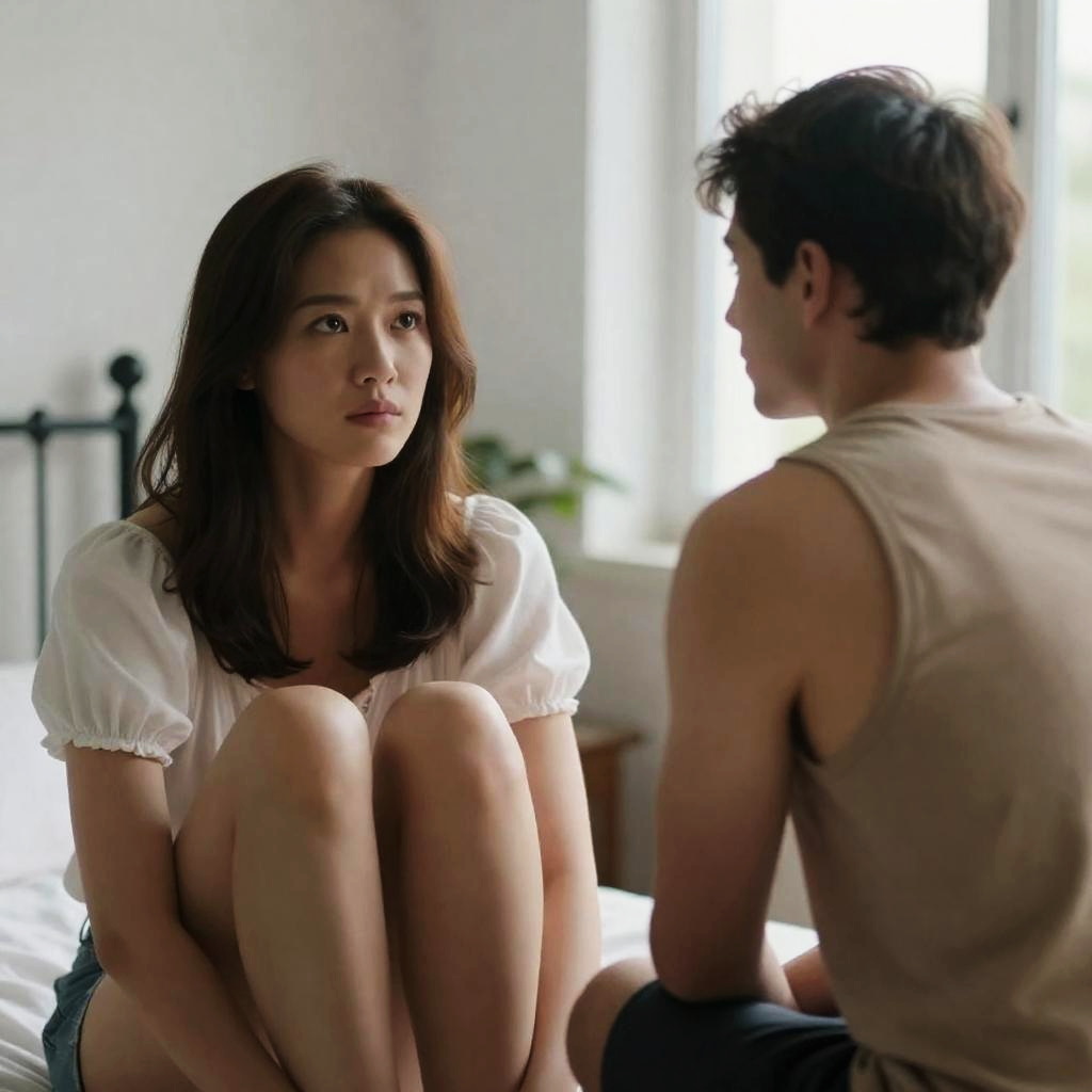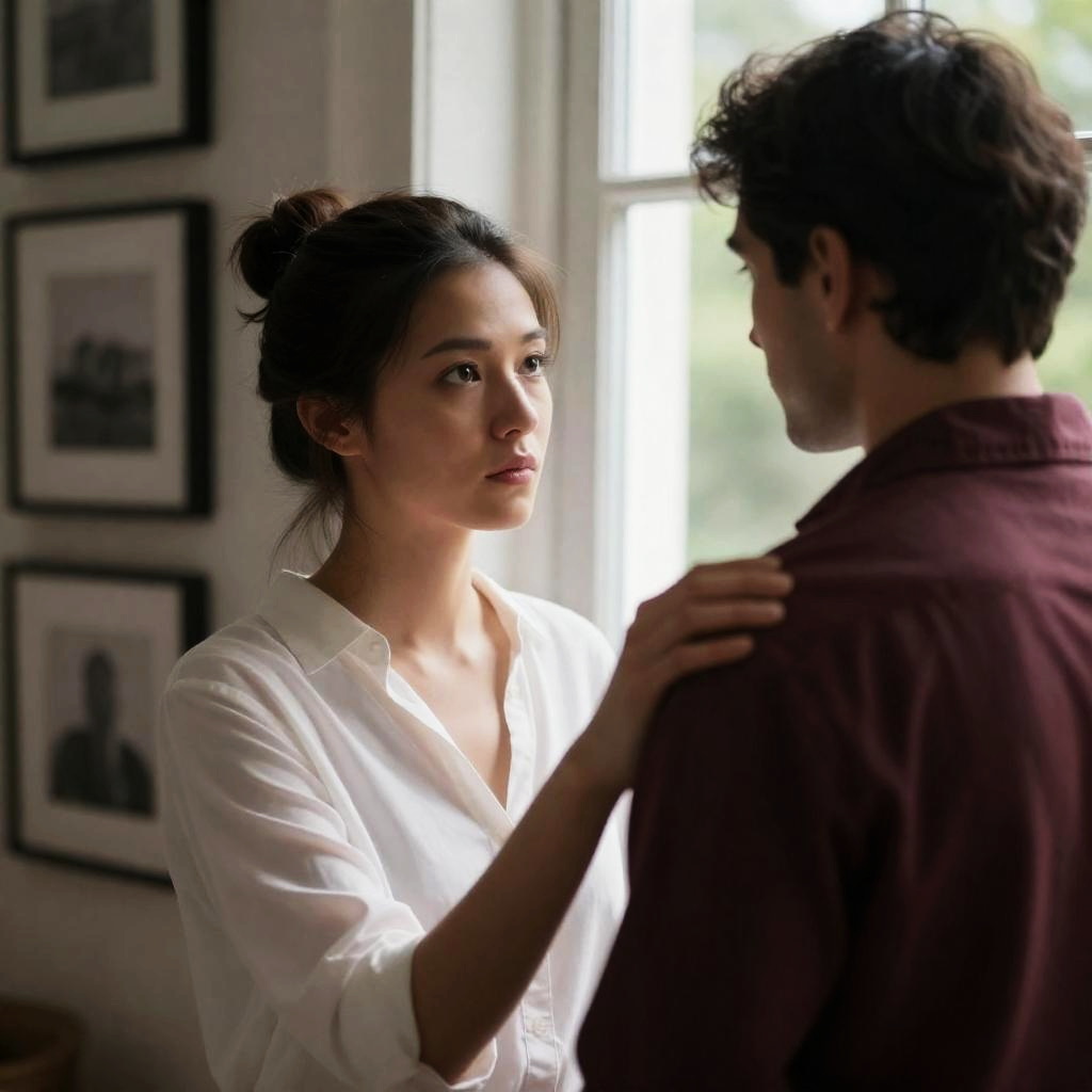 Photograph of a woman and man standing close by a window. Woman with fair skin, dark hair in a bun, wearing a white blouse, looks intently at the man. Man with dark, wavy hair, wearing a maroon shirt, faces away, woman's hand on his shoulder. Light from window illuminates their faces. Three black-and-white framed pictures on left wall. Greenery visible outside window. Woman's expression is serious, man's back to camera.