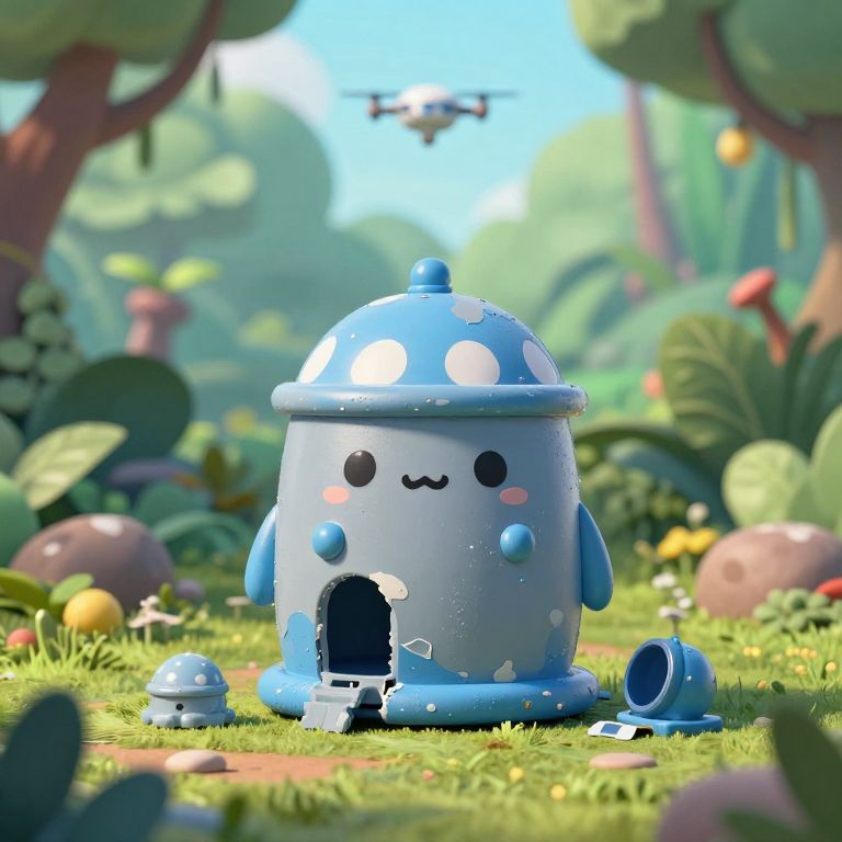 3D rendered kawaii style small blue-gray time machine repair shop with chipping paint, set in a jungle environment. The shop features a cute face with rosy cheeks and has broken time machine parts outside. Lush greenery and trees surround the shop with a distant flying drone above, captured in ultra-high definition.