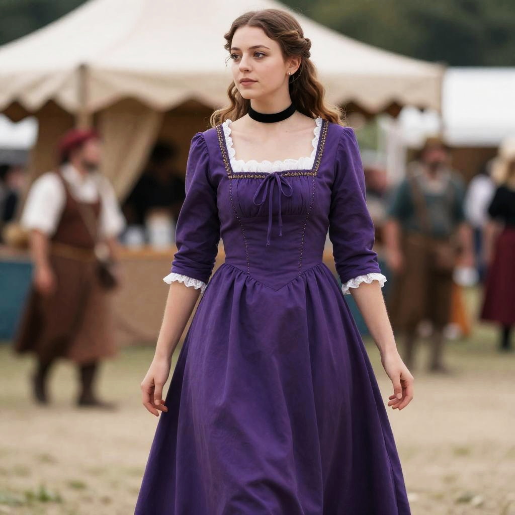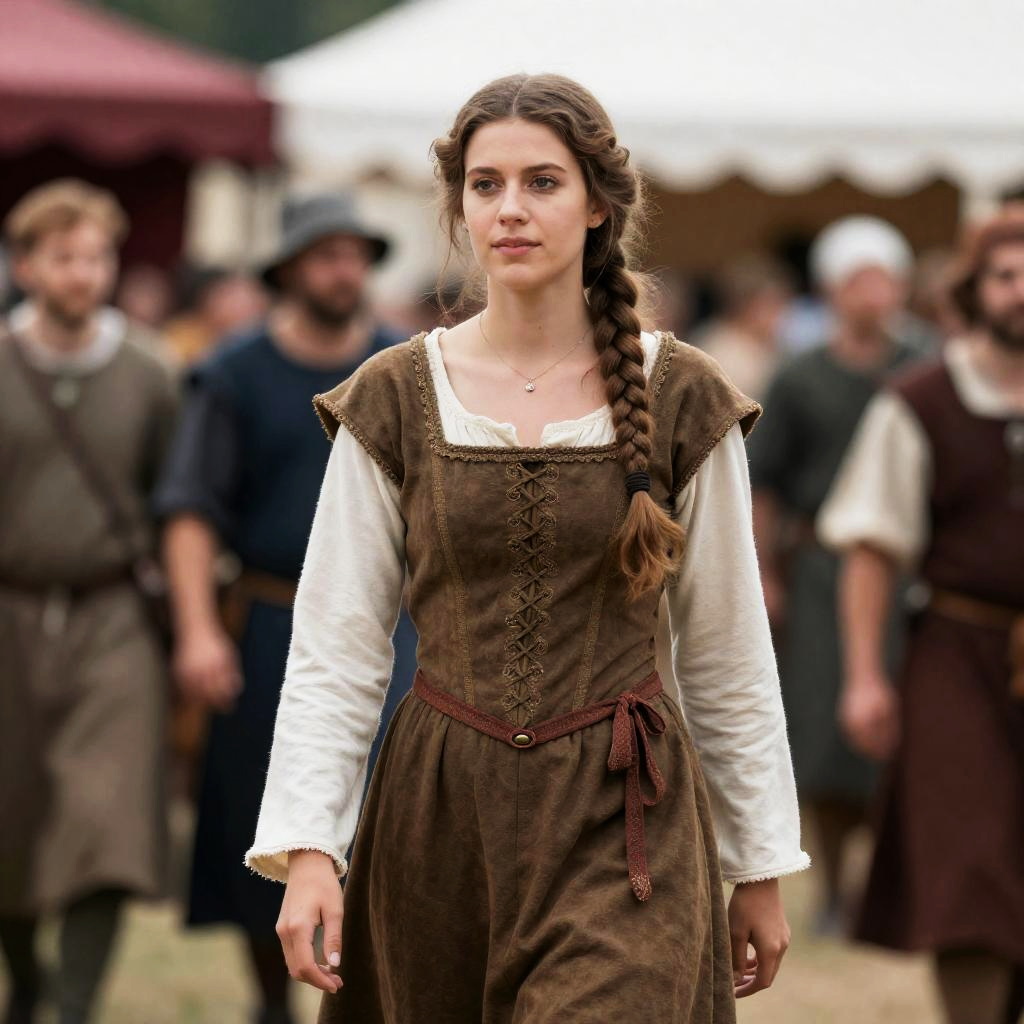 Young Caucasian woman wearing a brown medieval-style dress with a white long-sleeve blouse underneath, standing confidently in a crowd at a Renaissance festival. Her hair is styled in a long braid, and she is surrounded by people dressed in period costumes, evoking a historical atmosphere.