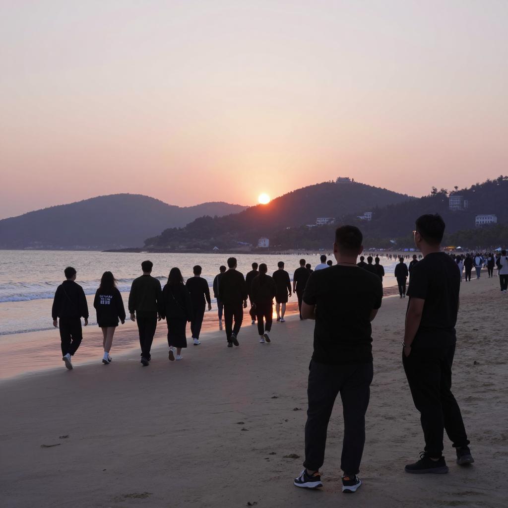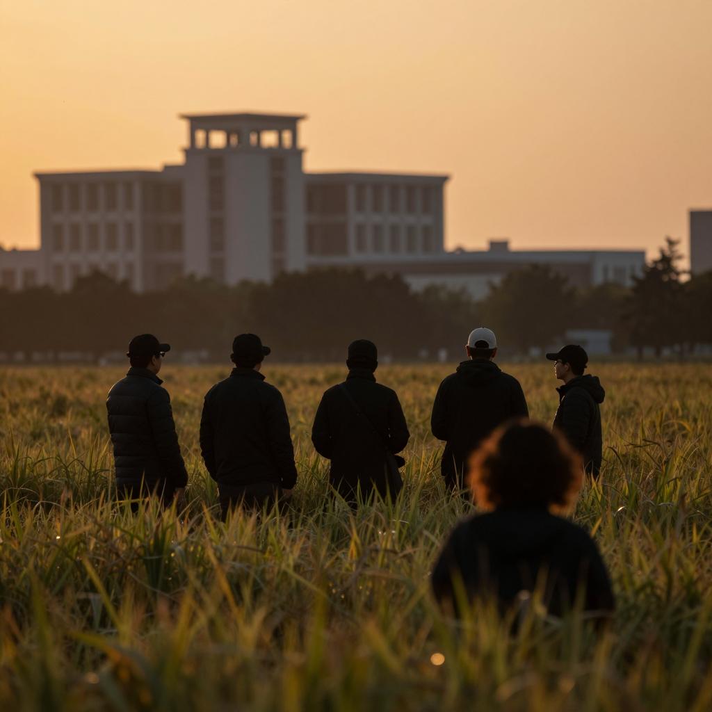 Silhouetted people standing in tall grass at sunset. Five people in dark clothes and hats, one with curly hair in foreground. Large, shadowy building with a tower in background. Warm, orange sky. Dust particles visible in air.