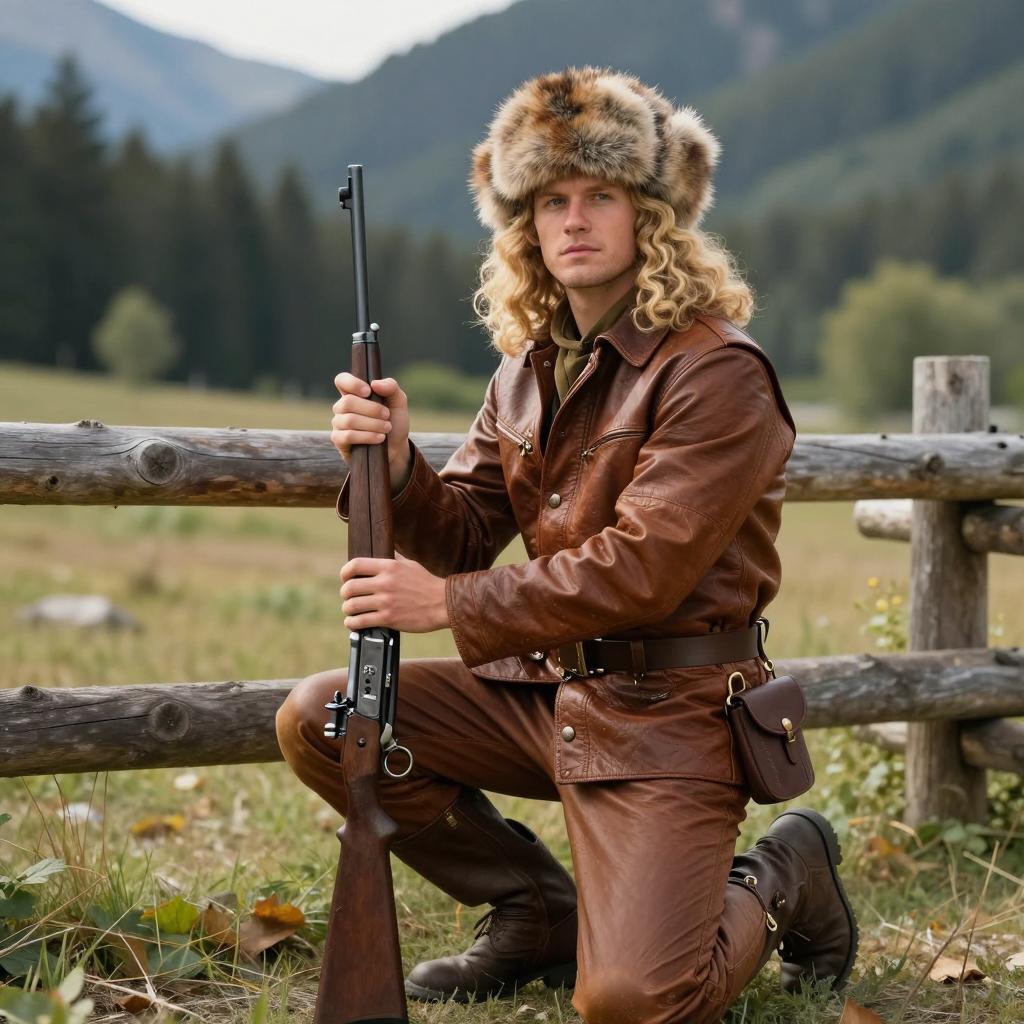Focused Man in Fur Hat and Rifle