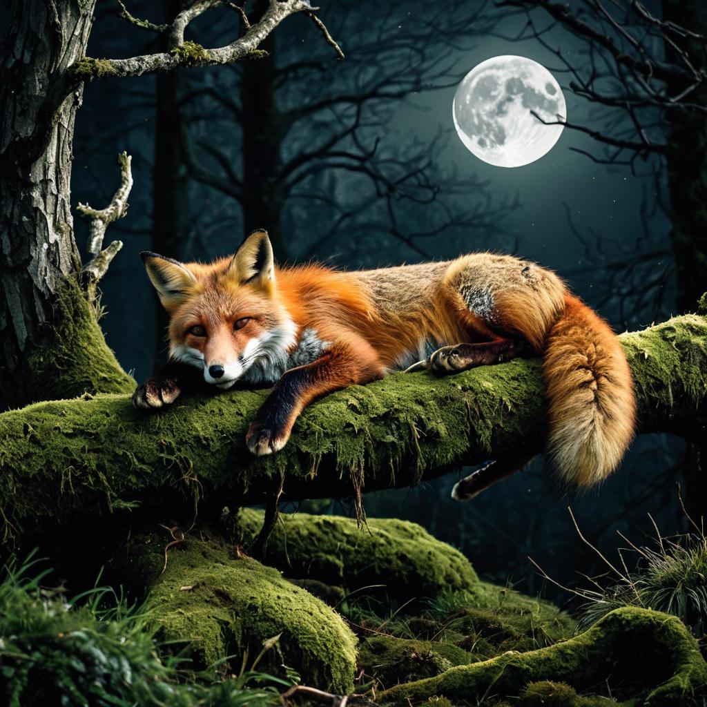 Digital illustration of a playful red fox cub peeking from behind a tree trunk in a quiet, foggy woodland. The scene includes scattered wild berries and glowing fireflies, rendered with vibrant hues, soft light, and a warm color palette.