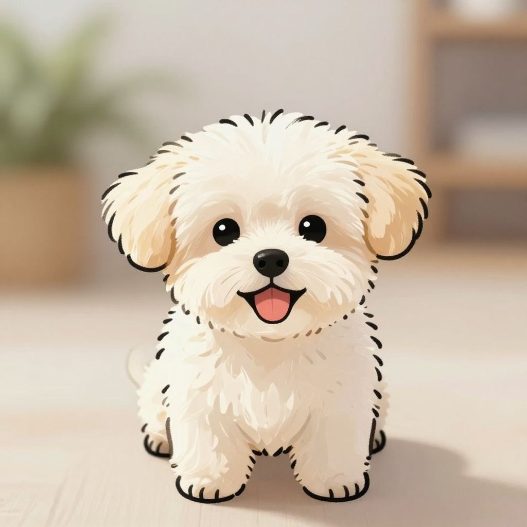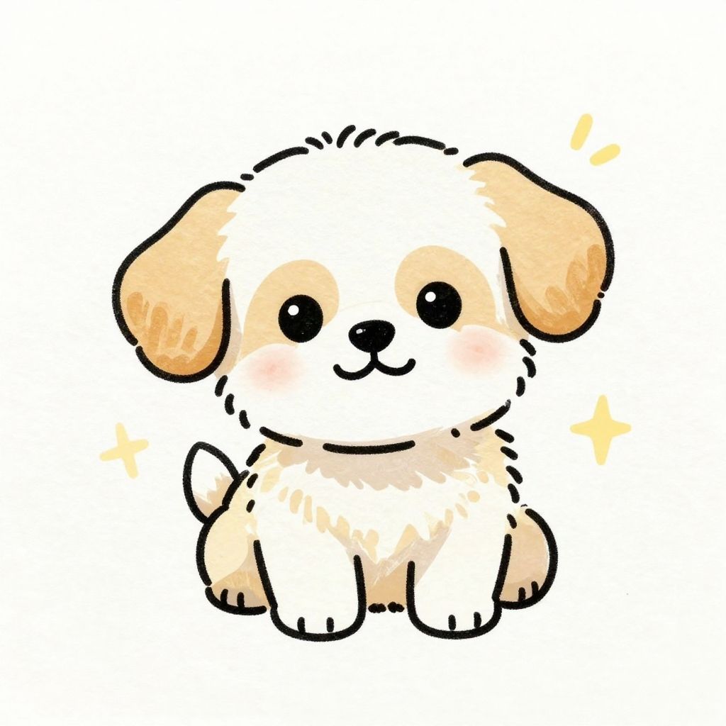 A digital drawing of an adorable, fluffy white puppy with light beige ears and patches on its cheeks and belly. The puppy has large, black, round eyes and a small, black nose. It sits with a cute smile, small paws in front, and a tiny, bushy tail behind. The background is plain white with a few yellow sparkles around the puppy, adding a touch of whimsy. The style is cute and chibi-like, with thick, black outline and soft, pastel colors. The overall feel is cheerful and endearing.