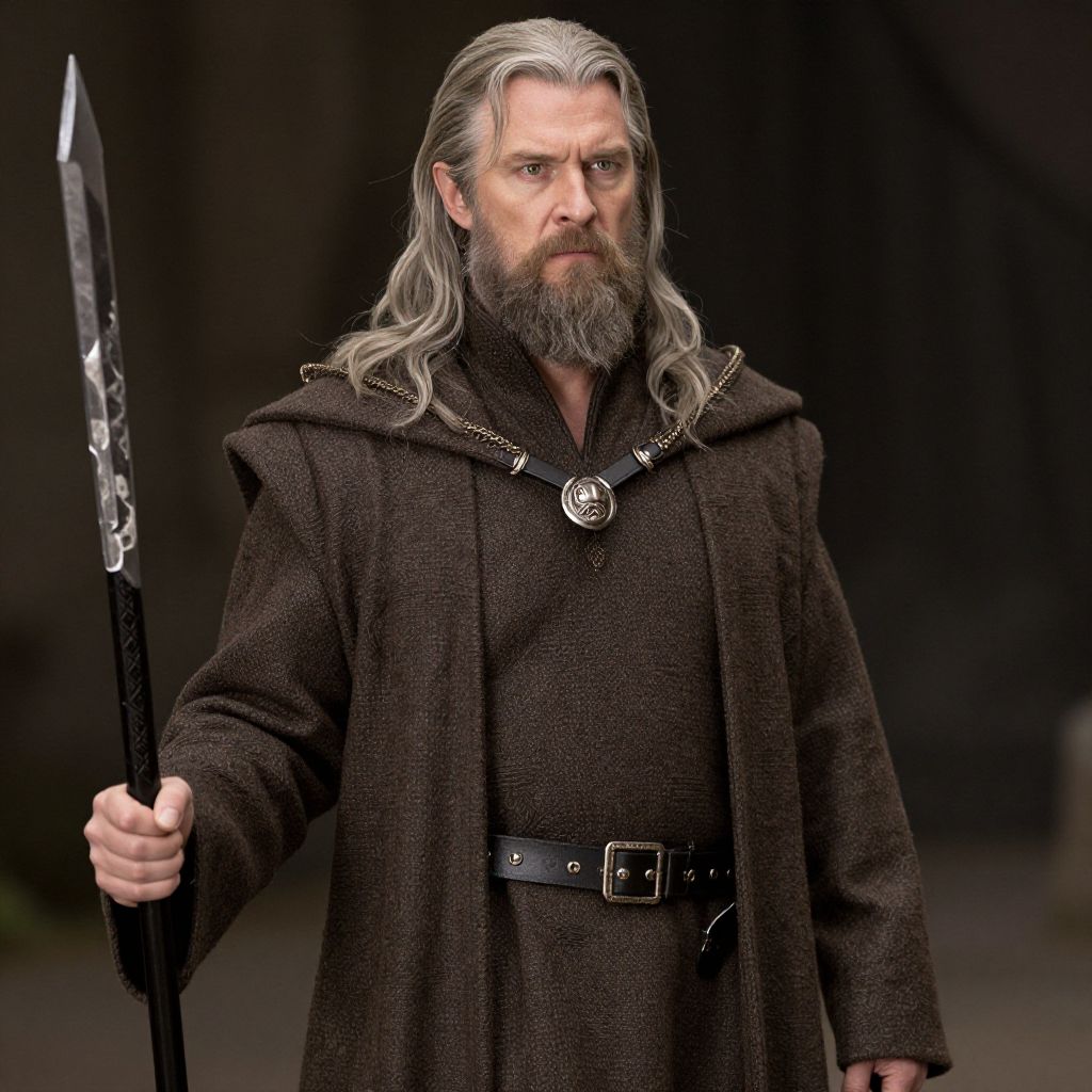 Photorealistic CGI of a stern, bearded man with long gray hair, wearing a dark brown cloak and holding a black sword with a silver emblem