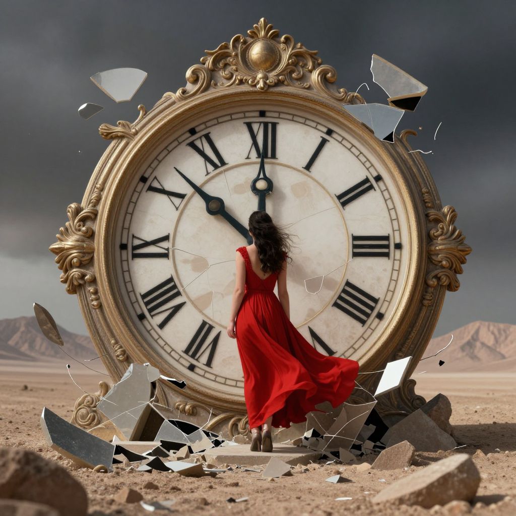 In this surrealistic image, a woman in a flowing red dress stands at the center of a large, ornate clock that has been shattered into fragments. The clock's face, with its Roman numerals and intricate carvings, is partially obscured by the cracks and debris. The woman, with her back to the viewer, appears to be emerging from the broken clock, creating a sense of time and reality being disrupted. The background features a desert landscape with a distant mountain range, adding to the dreamlike quality of the scene. The colors are muted, with the red dress of the woman standing out against the neutral tones of the desert and the dark, smoky sky. The overall composition is dynamic, with the shattered clock and the woman's figure creating a focal point that draws the viewer's eye through the scene.