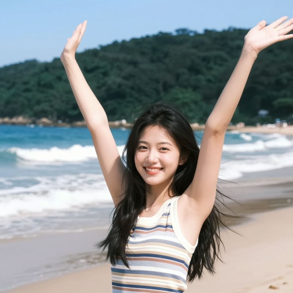 A photograph of an Asian woman with long black hair, wearing a white, sleeveless, striped tank top, standing on a sunny beach with her arms raised in joy. She has a bright smile, fair skin, and is positioned in the foreground. The background features a clear blue sky, turquoise ocean with white waves, and a dense, green forested hill. The sand is light beige, and the image has a high-contrast, slightly over-saturated color style, emphasizing the bright, cheerful atmosphere.