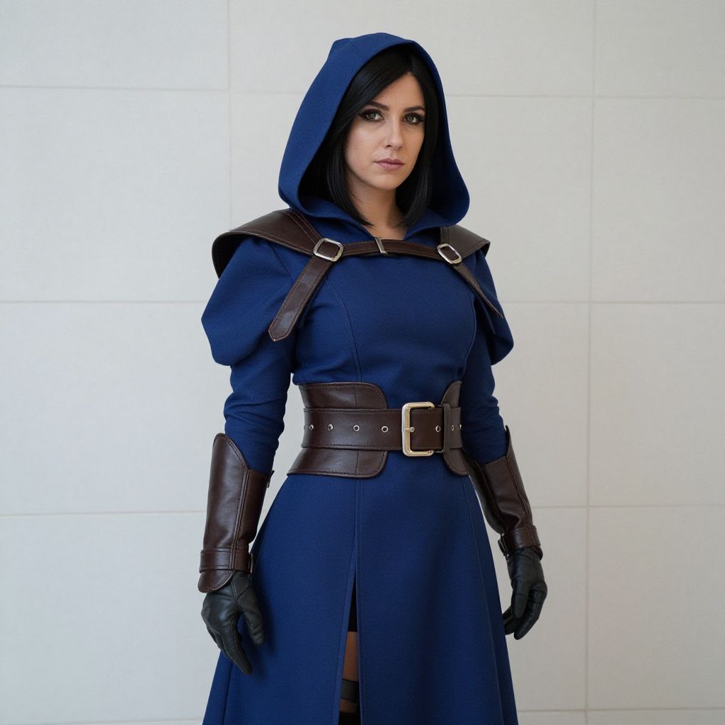 A woman dressed in a detailed, realistic Ana Amari cosplay costume from the popular video game Overwatch stands confidently against a tiled wall. She wears a deep blue hooded cloak with leather strap accents and a wide belt, embodying the character's signature look with striking authenticity.