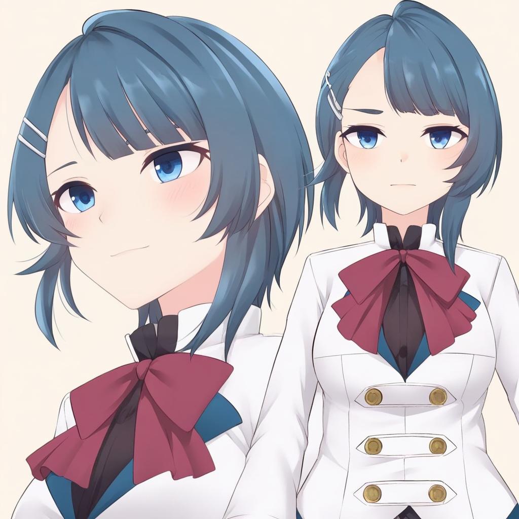 Aizawa kazuha, assault lily, 1girl, blue eyes, blue hair, asymmetrical hair, short hair, medium hair, blunt bangs, hairclip, medium breasts, herensuge girls academy school uniform, school uniform, long sleeves, red bowtie, by artist beijuu, animagine