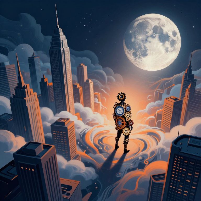 This digital illustration depicts a surreal cityscape at night with a large, bright full moon in the sky. The city is filled with tall, dark skyscrapers with illuminated windows. A central figure, composed of interlocking gears, stands amidst swirling orange and white clouds. The figure's silhouette casts a long shadow over the city, adding a dramatic effect. The background features a starry sky, enhancing the surreal atmosphere. The colors are primarily dark blues and blacks with bright orange and white accents. The overall style is a blend of steampunk and surrealism, creating a fantastical urban scene.