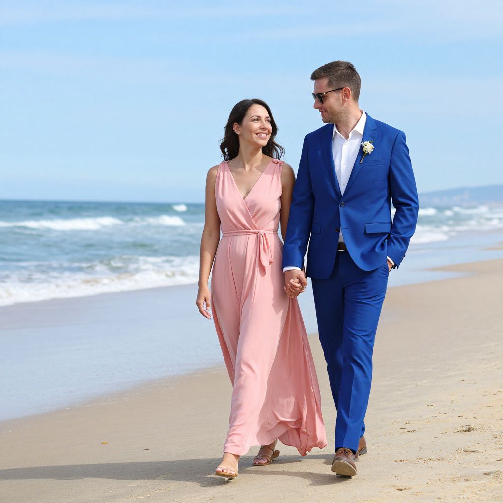 Couple strolling along a sandy beach, the man in a vibrant blue suit with a boutonniere and the woman in a flowing pink dress, both smiling as they walk hand-in-hand near the ocean's edge under a clear blue sky.