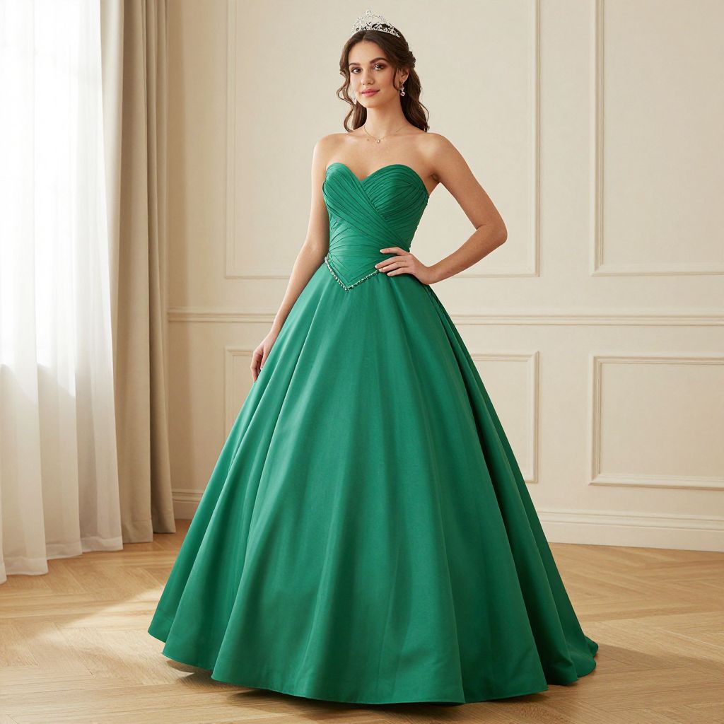 Green Ball Gown Costume, a woman in a green dress standing in a room