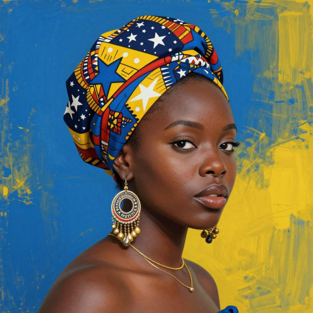 Photograph of a dark-skinned Black woman with a radiant complexion, wearing a colorful, patterned headwrap featuring stars, stripes, and geometric shapes in blue, red, yellow, and white. She has large, intricate, gold hoop earrings and a delicate gold necklace. Her expression is calm and confident. The background is a vibrant mix of blue and yellow, with abstract brushstrokes. She is shown from the shoulders up, with a bare shoulder visible, suggesting she may be topless or wearing a strapless garment. The image has a vivid, pop-art style.