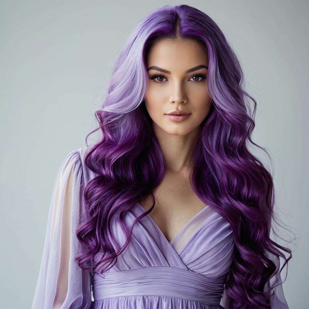 Purple wig short hair, photorealistic portrait of a young woman with light purple bob wig, bangs, wearing a shiny lavender satin sleeveless top, neutral grey background, light skin tone, blue eyes, minimal makeup, centered composition, studio lighting, portrait, simple background, close-up, feminine, elegant, modern hairstyle, soft colors, smooth ures