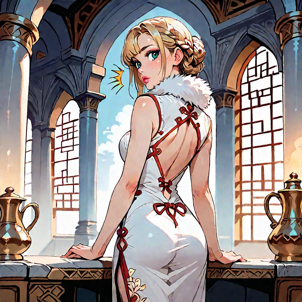 Illustration of a blonde anime woman with green eyes wearing a golden white traditional Chinese dress with a fur collar and intricate red ribbon details. She is standing indoors in a grand palace with large arched windows and tall columns, looking back with a surprised expression. Her hair is styled in a long braid with a bun, complementing the elegant and regal atmosphere.