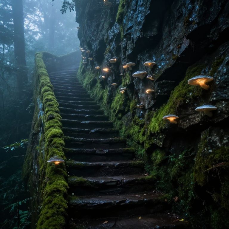 A mystical stairwall ascending through an ancient forest, with moss-covered stone steps built directly into a towering cliff face wall, shrouded in mist and illuminated by ethereal glowing fungi, evoking a sense of enchanted nature and hidden magic.