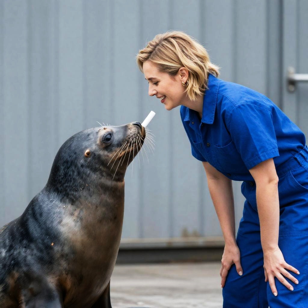 Photograph of a man with curly blond hair, smiling at a black seal wearing a necklace with a peace symbol. The man holds a fishing line with bait in his right hand. Background shows a metallic, industrial setting. The seal is standing on the left, looking at the man. The man is on the right, leaning forward. Intense interaction between man and seal.