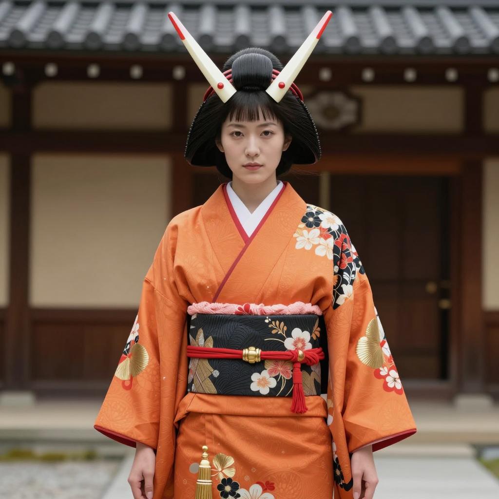 Spring fashion costume, photorealistic, asian woman, standing in park, cherry blossom trees, spring, wearing yellow floral kimono, belt tied at waist, slightly uneven hem, brown sandals, short black hair, serious expression, green grass, blurred background, daylight, natural light, realistic ures, soft colors, vertical orientation, medium shot
