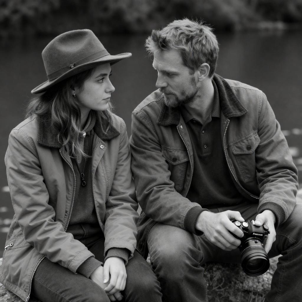 Black-and-white photograph of a man and woman in rugged outdoor clothing, seated by a body of water. The man, with short hair and a beard, leans towards the woman, who wears a hat and gazes at him. He holds a camera, pointing it towards her. The woman's expression is contemplative. The background is dark, with water visible.