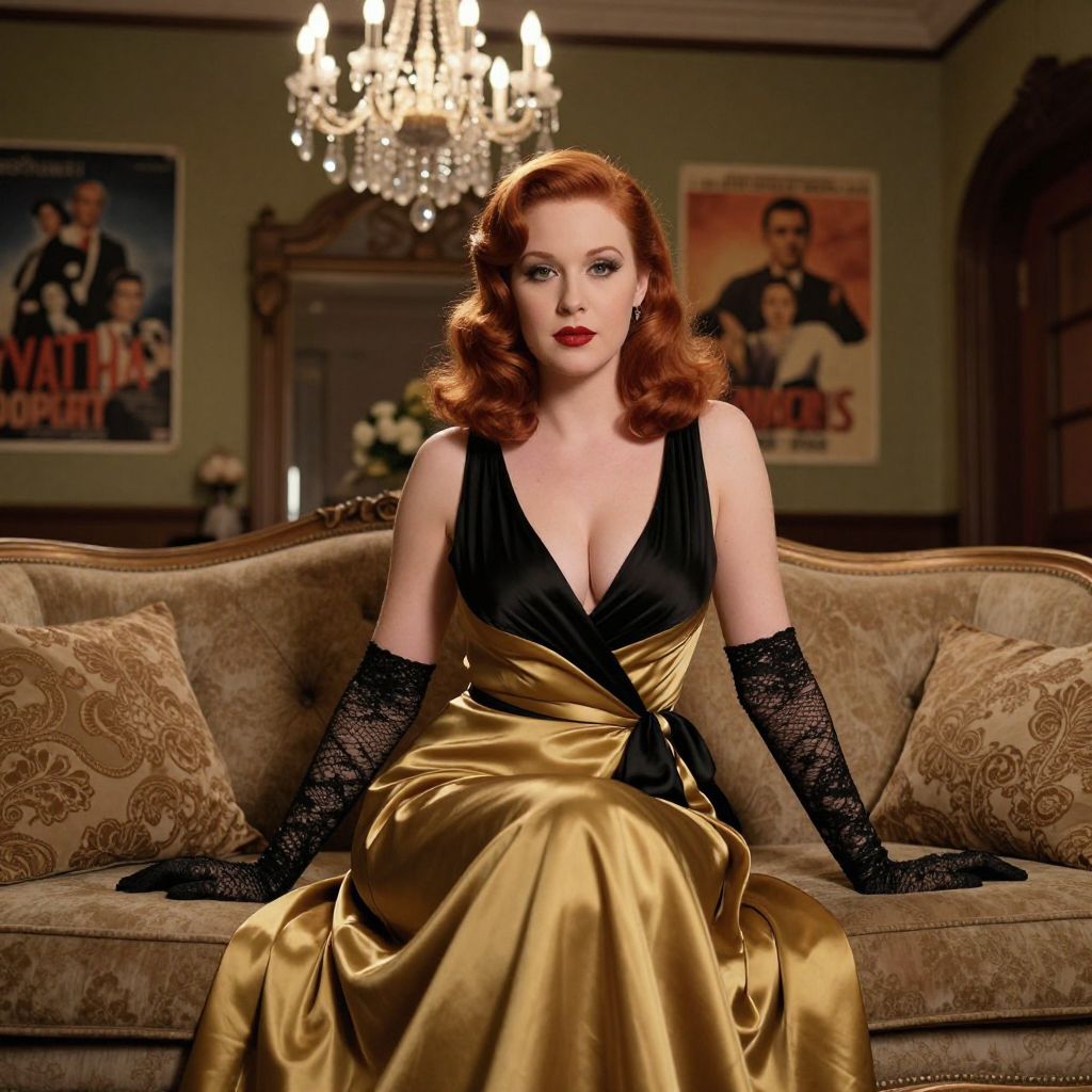 Photograph of a fair-skinned, red-haired woman with vintage-style makeup and red lipstick, sitting on a beige, ornately patterned sofa. She wears a deep V-neck, black and gold satin gown with black lace gloves. Her wavy hair is styled in 1940s waves. The background features green walls, a chandelier with lit bulbs, and two vintage movie posters. The lighting is warm, highlighting her elegant, classic look. The overall style evokes a retro Hollywood glamour vibe.