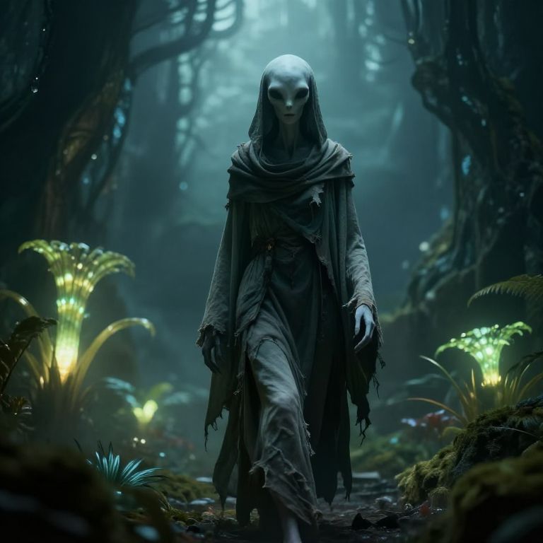 Alien with no eyes, pale and slender humanoid figure, cloaked in tattered robes, wandering through an ancient alien forest with glowing flora and mist, cinematic lighting