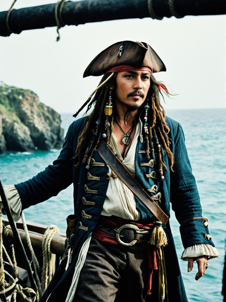 Man in Jack Sparrow Costume, cinematic realism, adventurous editorial shot