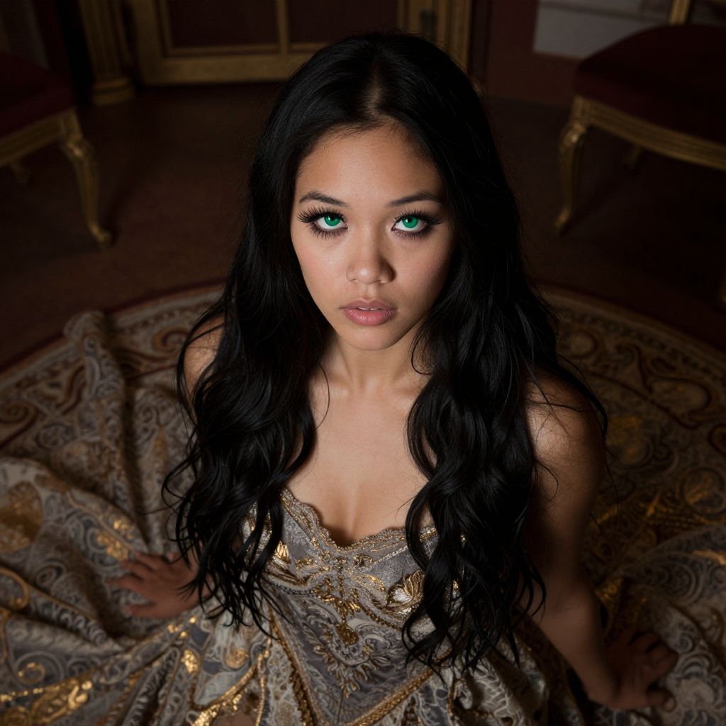 Photograph of an East Asian woman with long, wavy black hair and strikingly bright green eyes, sitting on an ornate, patterned carpet in a dimly lit, elegant room. She wears a luxurious, low-cut, silver and gold embroidered dress that accentuates her medium-sized breasts. The background includes a dark wooden chair with gold accents and a large, antique-style cabinet. Her makeup is subtle, highlighting her eyes with dark eyeliner and mascara. The overall mood is mysterious and elegant, with soft shadows enhancing her ethereal appearance.
