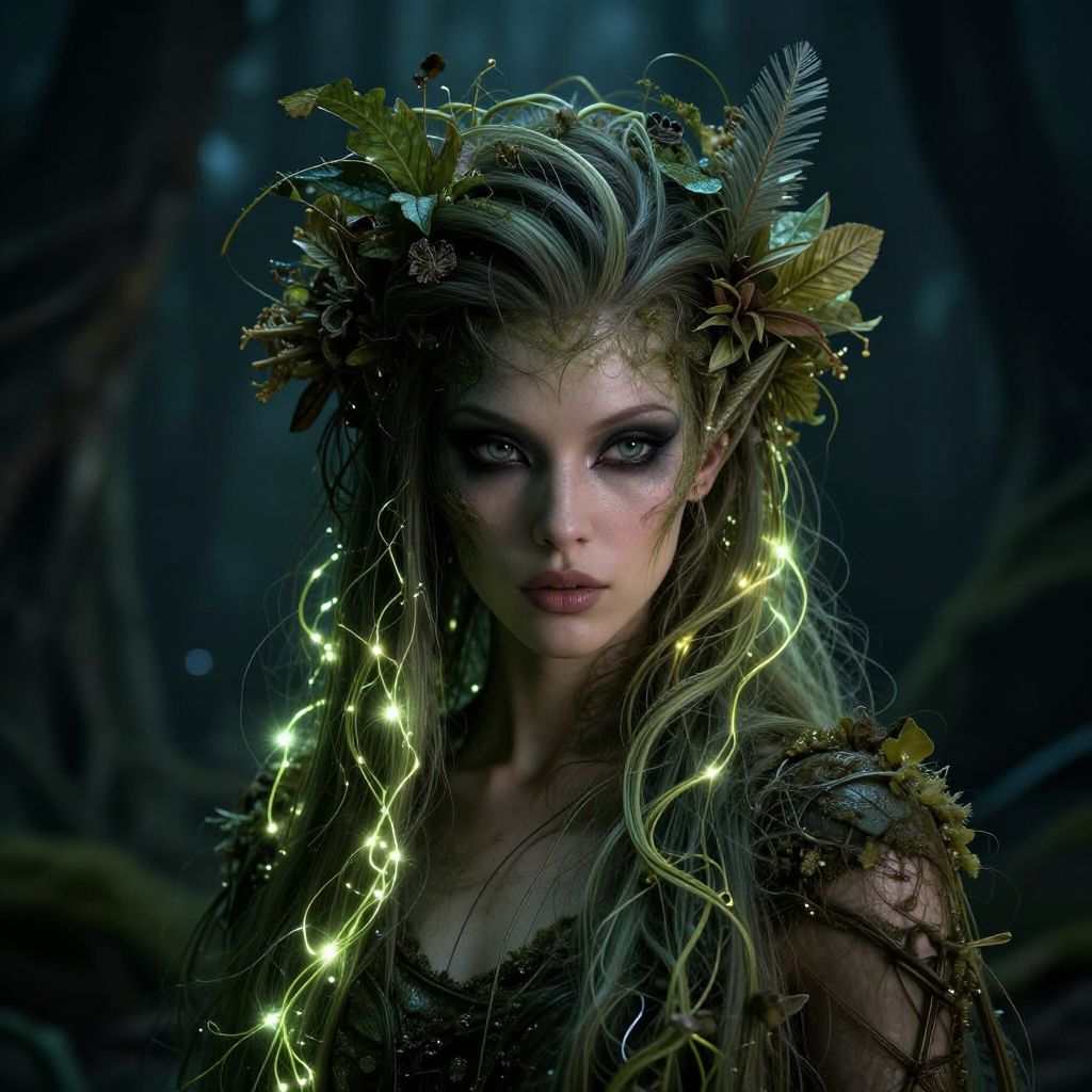 Mysterious forest elf with glowing lights in hair, dark makeup, feathered crown, and intricate black dress, illuminated by fairy lights. Digital art.