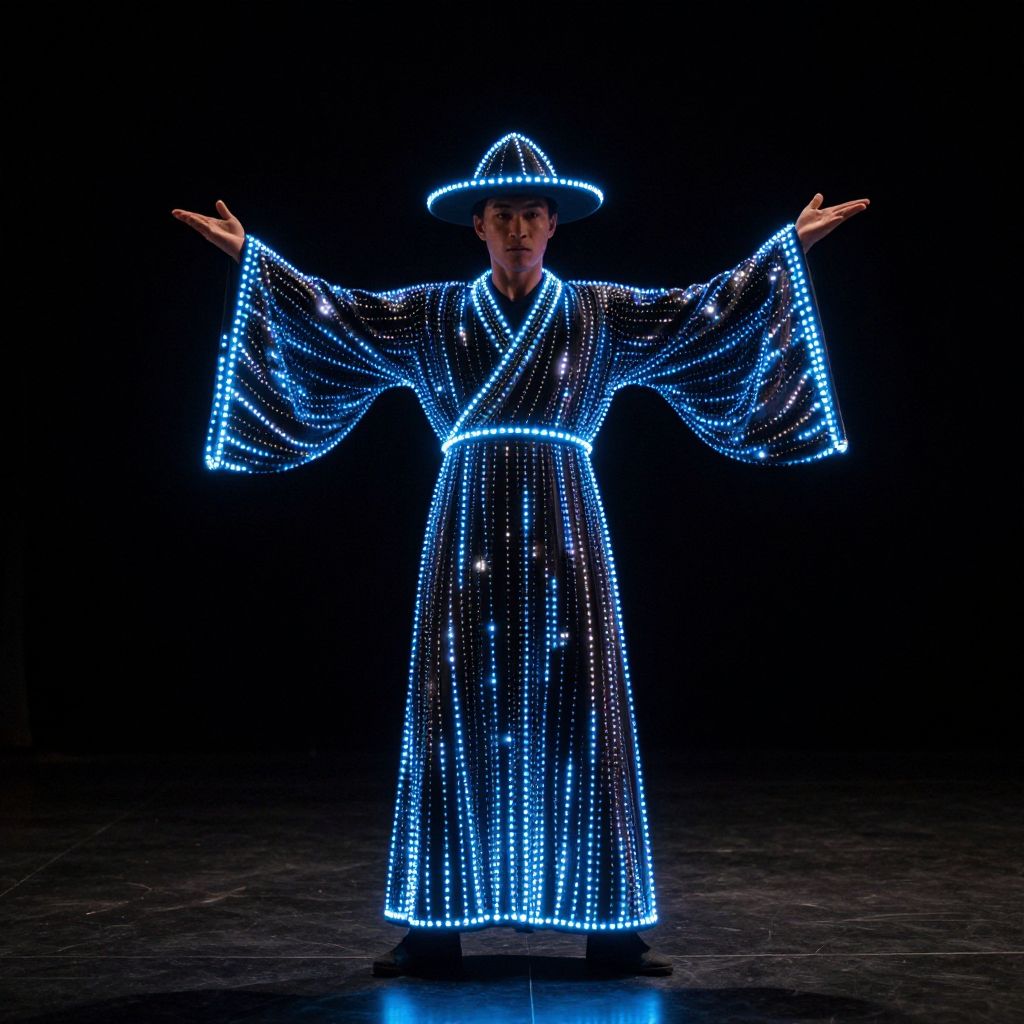 Led costume dance, solo, 1boy, male focus, standing, glowing, robe, wide sleeves, full body, hat