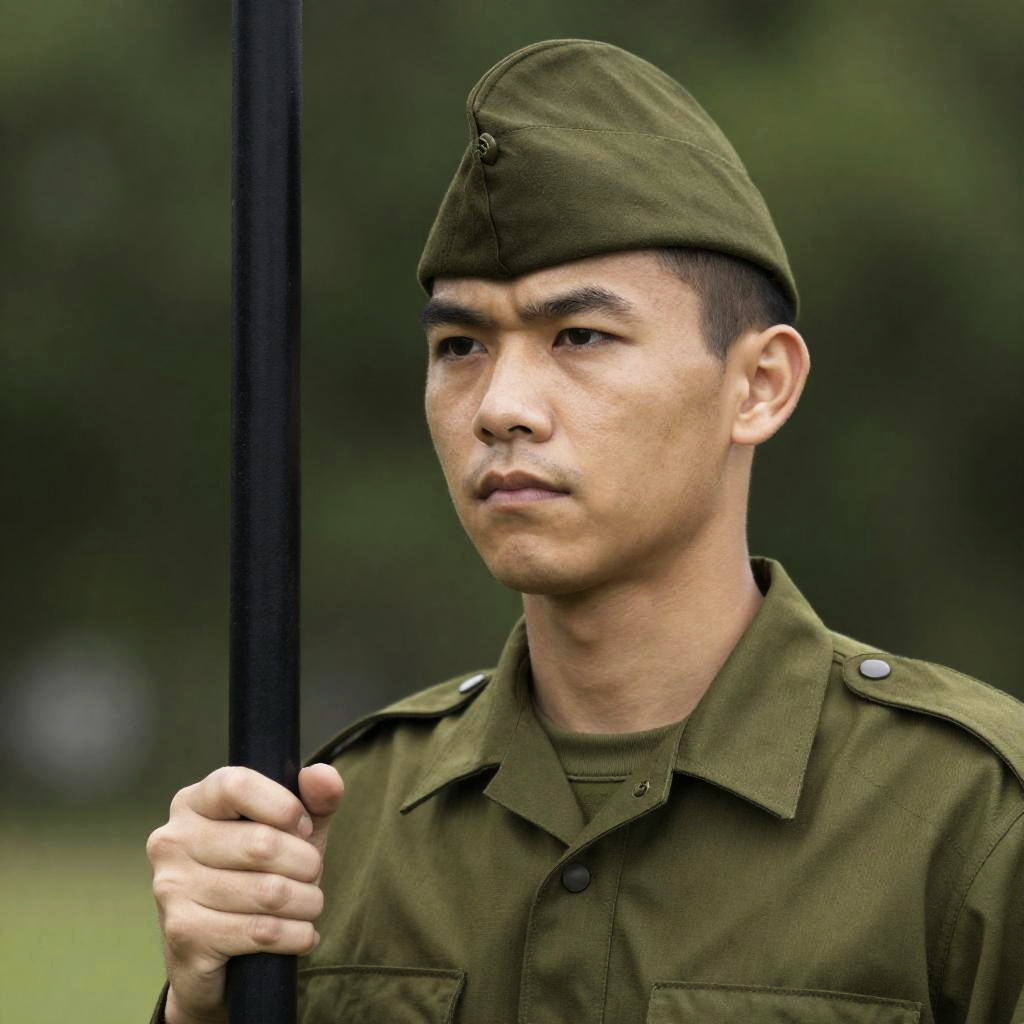 Male soldier in olive green military uniform with peaked cap, holding a black pole. Serious expression, green leafy background. Close-up, upper body, right side. Blurred foliage in background. Soldier's hand on pole, eyes looking off to the side.