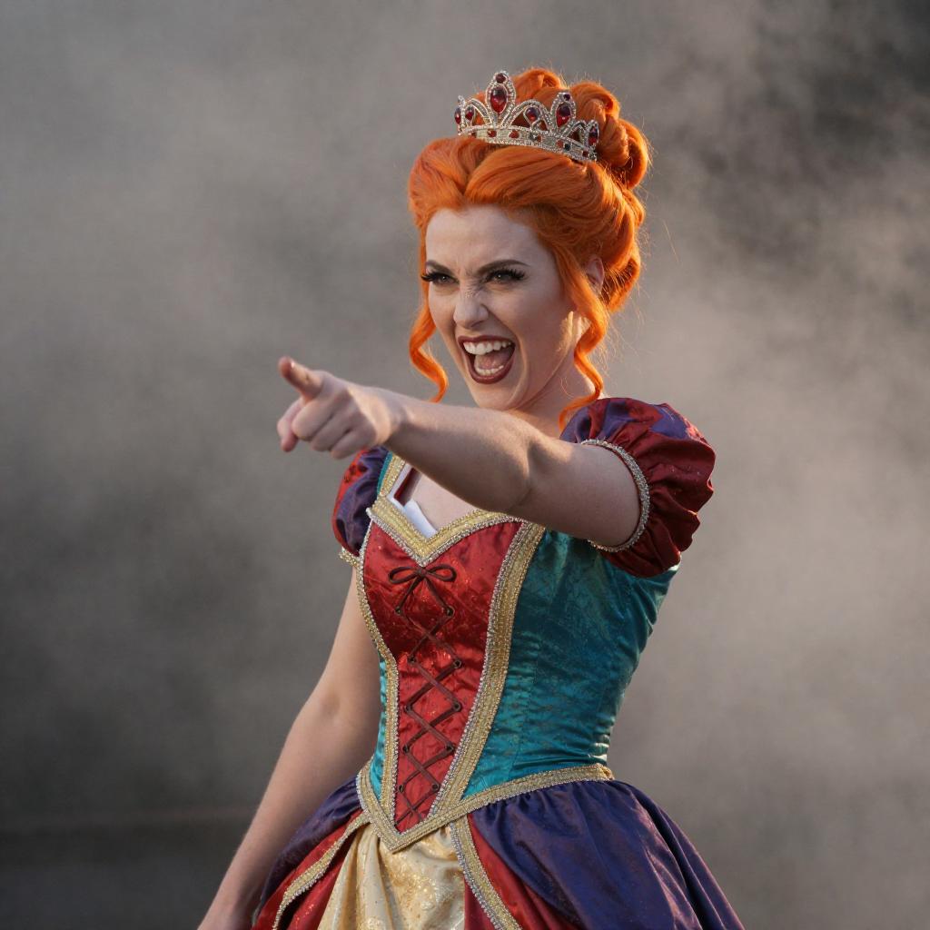 A woman with bright orange hair in an elaborate updo, wearing a colorful, ornate dress with red sleeves and a crown, points forward with an intense, joyful expression. She is surrounded by fog.