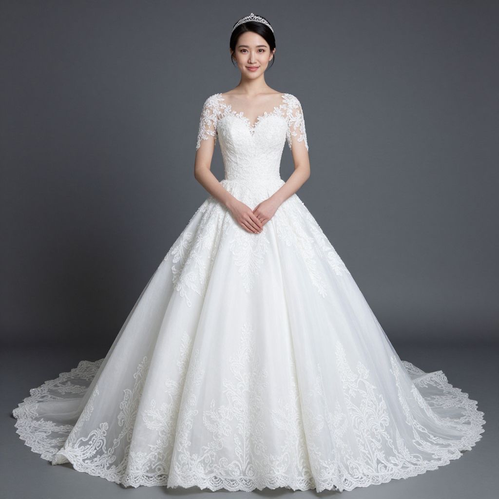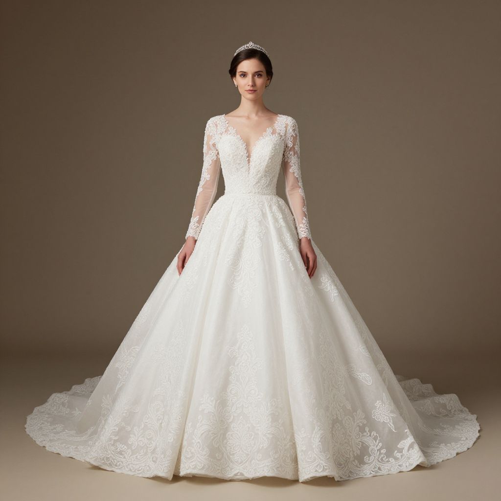 Photograph of a fair-skinned woman with dark brown hair in an elegant updo, wearing a full-length, white lace wedding gown with a deep V-neckline and long lace sleeves. The gown has a fitted bodice that flares out into a voluminous, floor-length skirt with a subtle train. The lace detailing is intricate and delicate, adding texture to the dress. She stands against a plain, gray background, looking directly at the camera with a neutral expression. A simple, sparkling tiara adorns her hair. The overall style is classic and sophisticated.