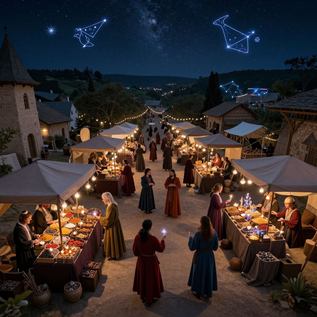 Photograph of a nighttime medieval market under a starry sky with constellation lights, illuminated stalls, and people in period clothing.