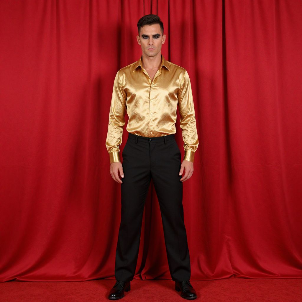 Photograph of a tall, attractive man with short, dark hair and light skin, standing confidently against a vibrant red curtain backdrop. He wears a shiny, gold silk dress shirt with the top buttons undone, revealing a hint of his chest, paired with black dress pants and black dress shoes. His expression is serious, with dark, defined eyebrows and subtle makeup. The red curtain's rich texture contrasts with the sleek, reflective quality of his shirt, creating a dramatic, luxurious atmosphere. The man's stance is straight and assertive, with his hands relaxed at his sides.
