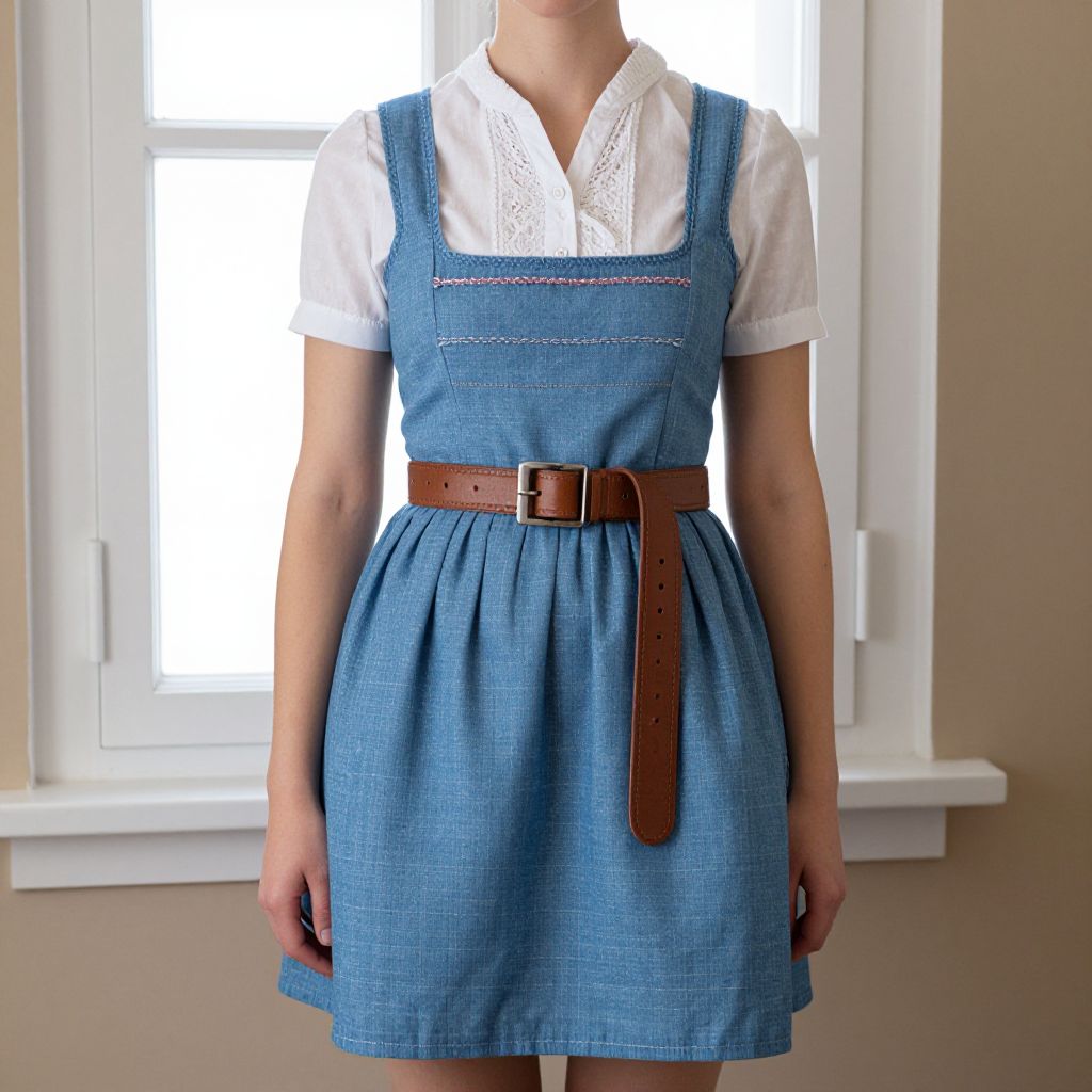 Photograph of a woman wearing a blue, short-sleeved, denim pinafore dress with a white lace-trimmed blouse and brown belt