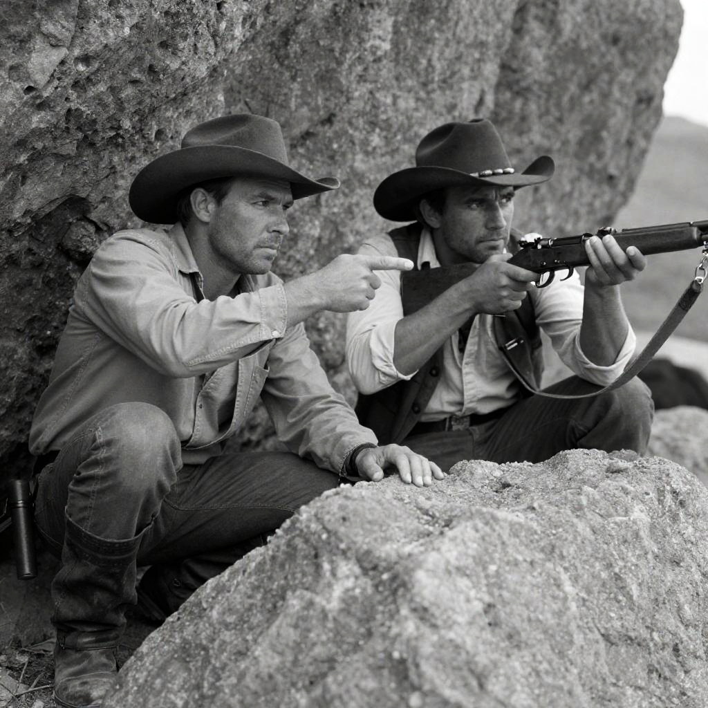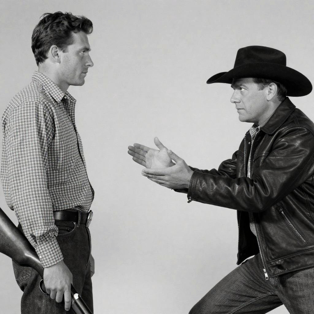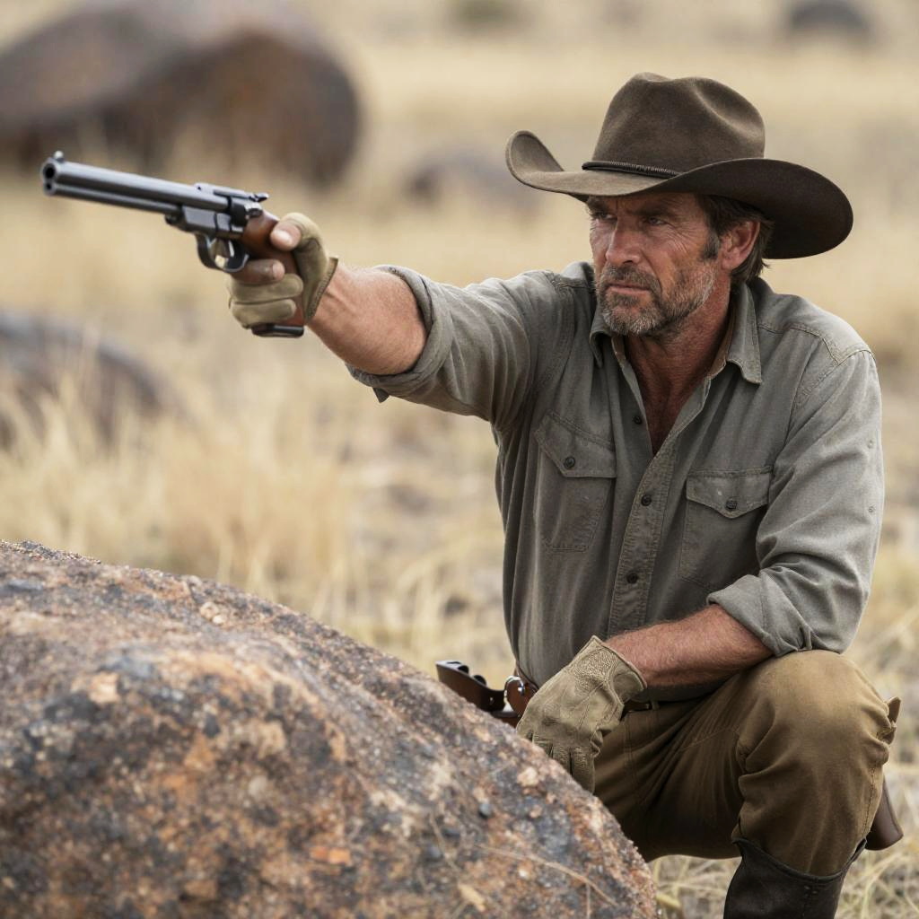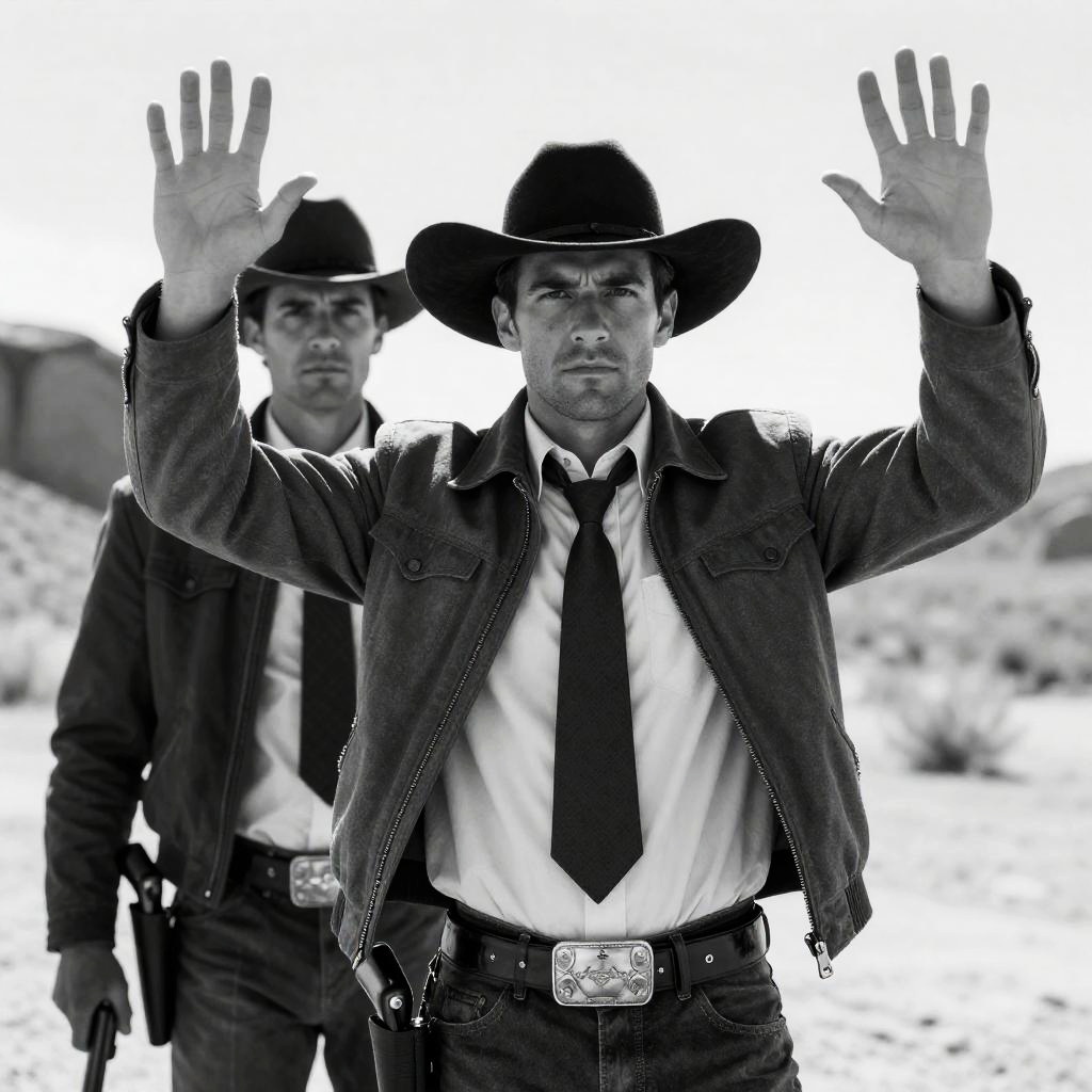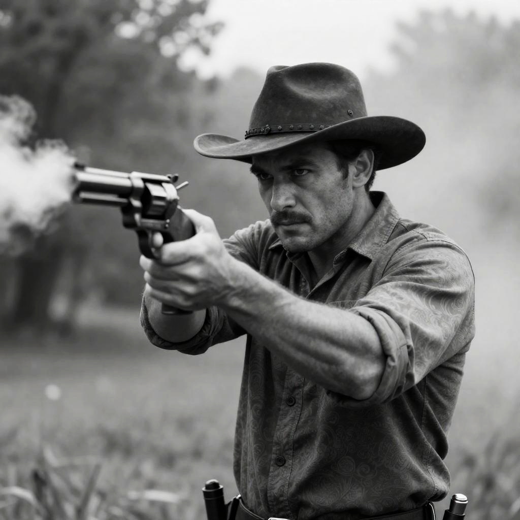 Black and white photograph of a man in a western setting. He stands with a serious expression, holding a gun in his right hand. He wears a light shirt, dark pants, and a belt with a holster. A wooden building with a sign "L FEIGHT" is in the background. A wooden fence is to the right. Desert terrain is visible.