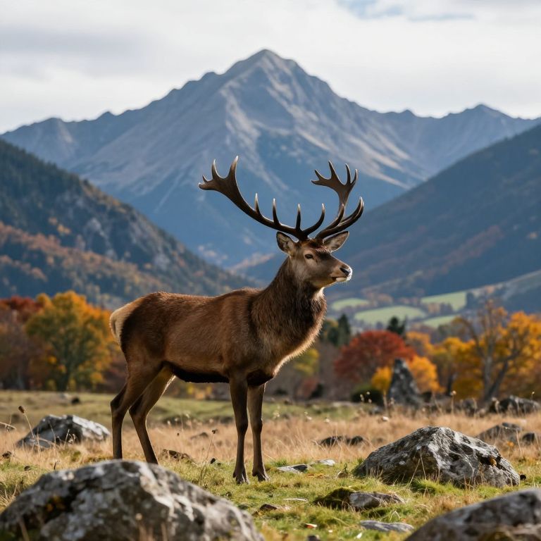 Stag stands majestically atop a grassy hill, its antlers silhouetted against a backdrop of towering mountains and a serene valley, surrounded by vibrant autumn foliage and scattered rocks.