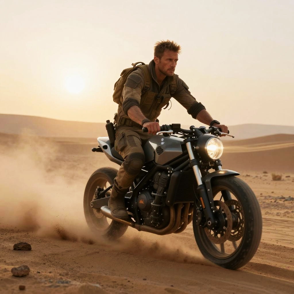 A group of riders clad in futuristic motorcycle armor battling in a post-apocalyptic wasteland, glowing visors and armored limbs reflecting scavenged technology and rugged terrain