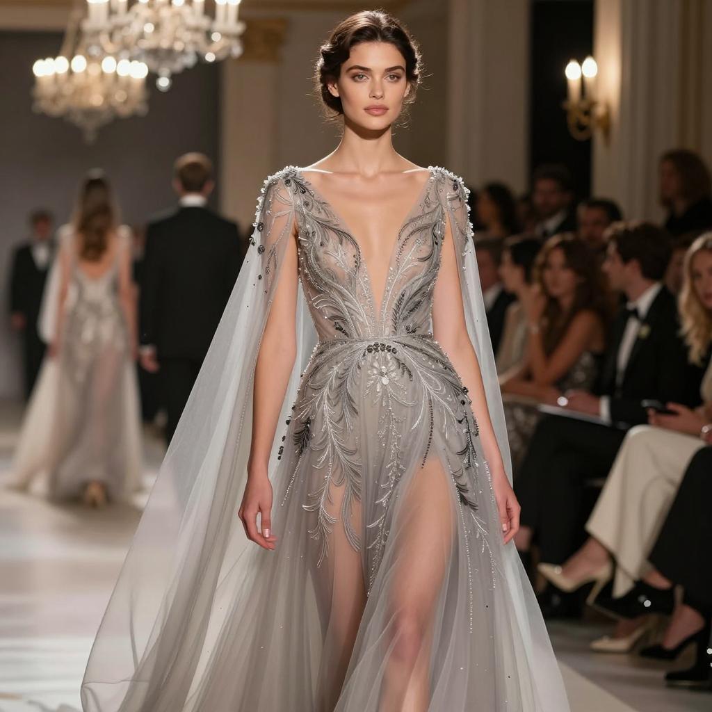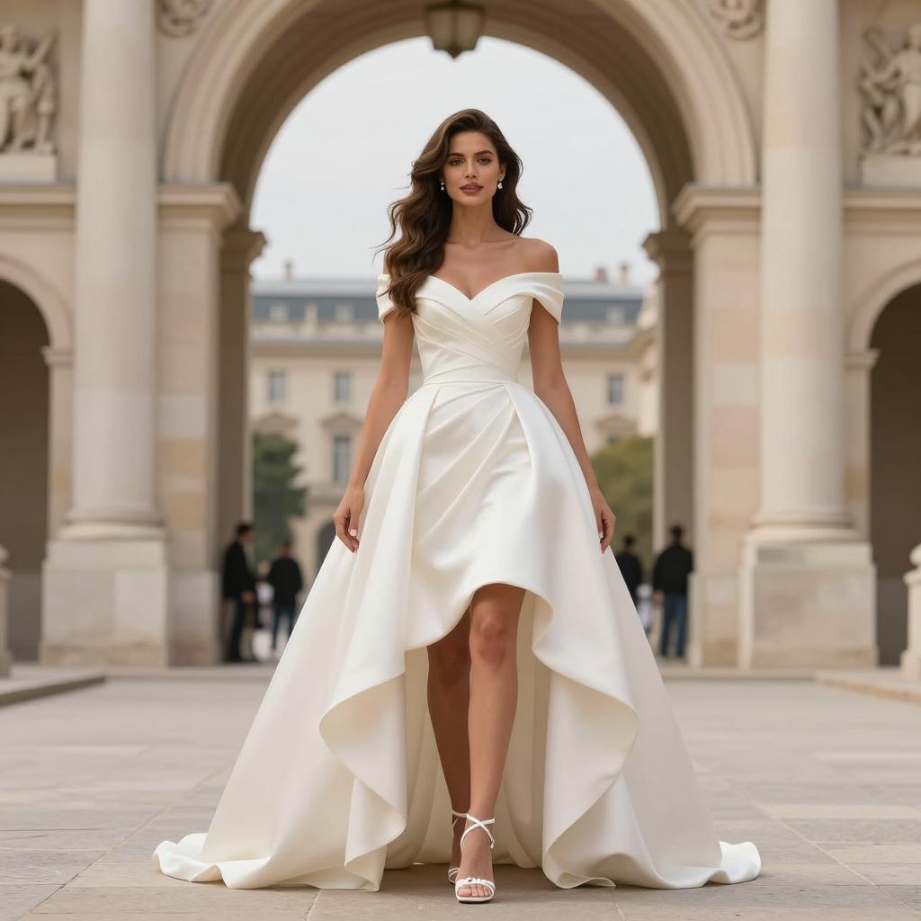 Long gown woman party, photorealistic, female model, full body, standing, front view, elegant red strapless gown, deep V-neck, form-fitting, floor-length, long wavy brown hair, light skin tone, glamorous, sophisticated, indoor setting, soft lighting, ornate floral decorations, beige and white drapes, chandelier in background, potted plant on right, runway, formal event, beautiful, confident, stylish, fashion, high-quality, detailed, realistic ure, evening attire