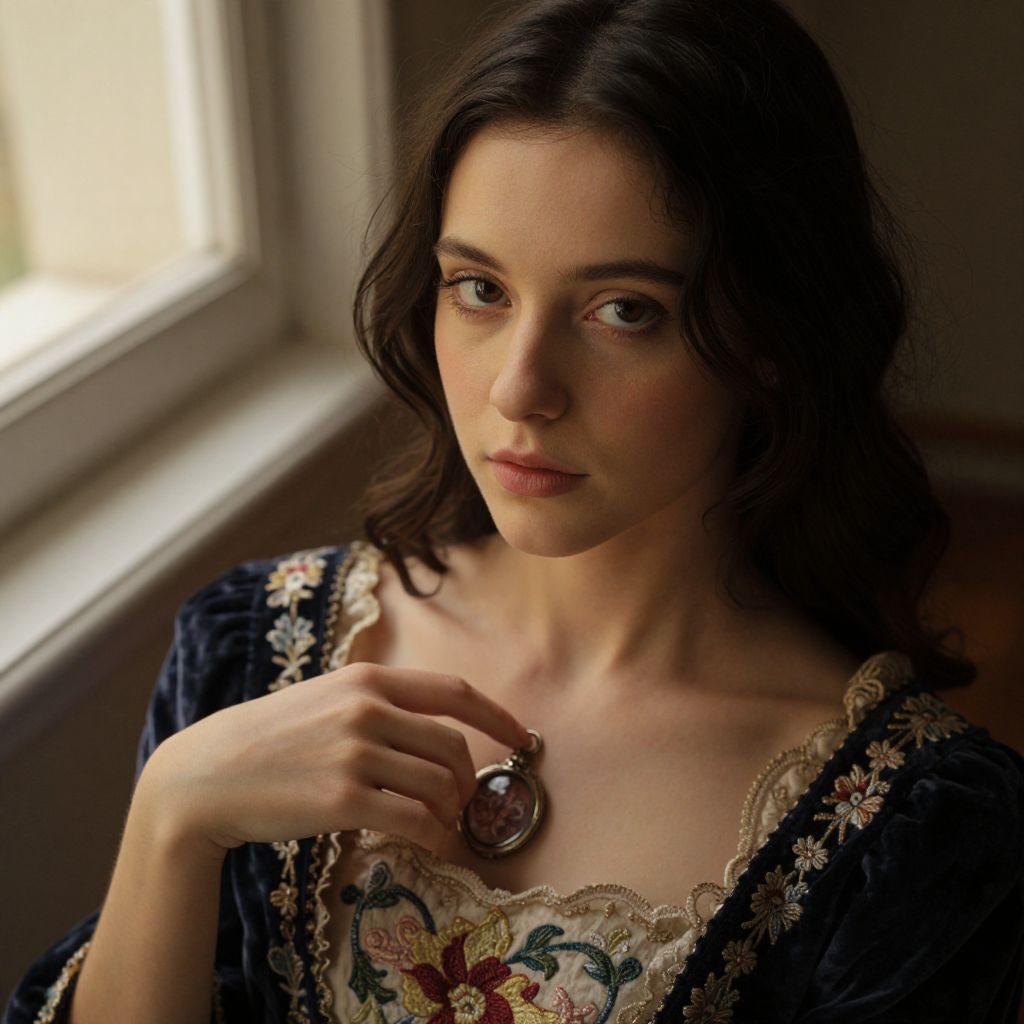 Photograph of a young Caucasian woman with fair skin and dark brown wavy hair, sitting by a window. She wears a black, velvet dress with intricate, colorful floral embroidery and lace trim. Her right hand is gently touching a silver locket around her neck. The soft natural light from the window highlights her delicate features and focused expression. The background is slightly blurred, focusing attention on her face and dress. The image has a warm, vintage feel.