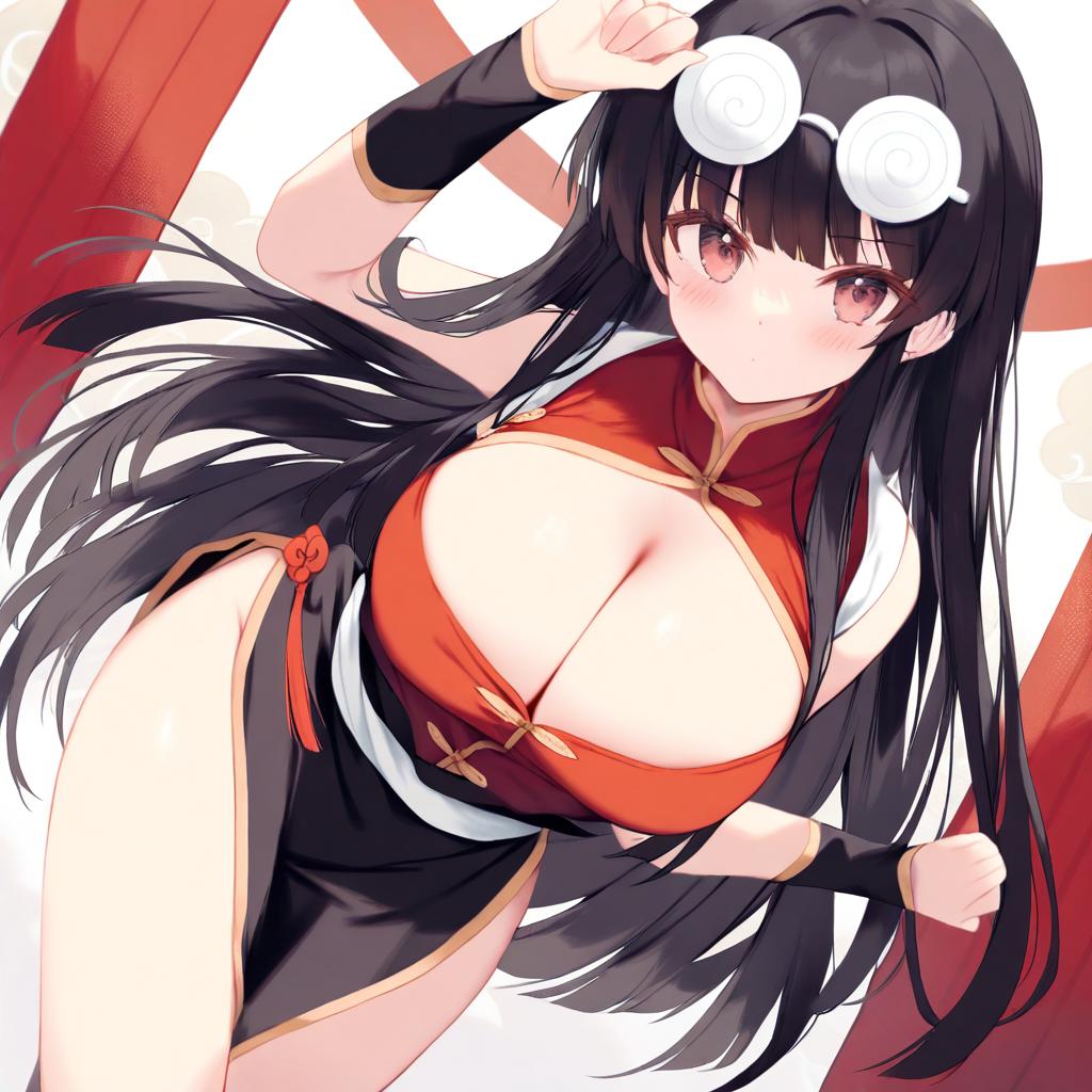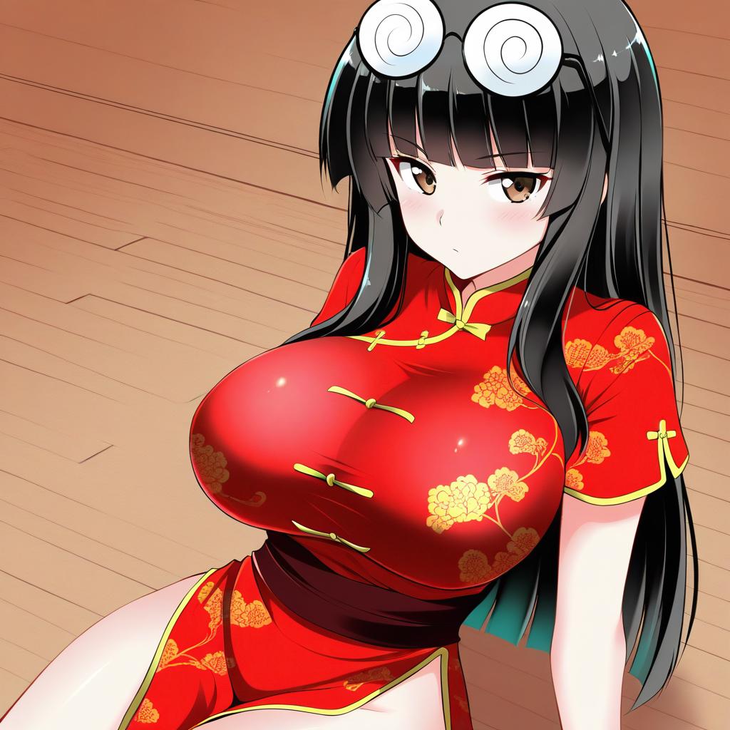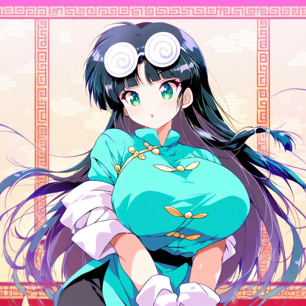 Mousse (ranma 1/2), ranma 1/2, 1girl, coke-bottle glasses, eyewear on head, long hair, black hair, blunt bangs, huge breasts, chinese clothes, chinese clothes, by artist morii shizuki, illustrious