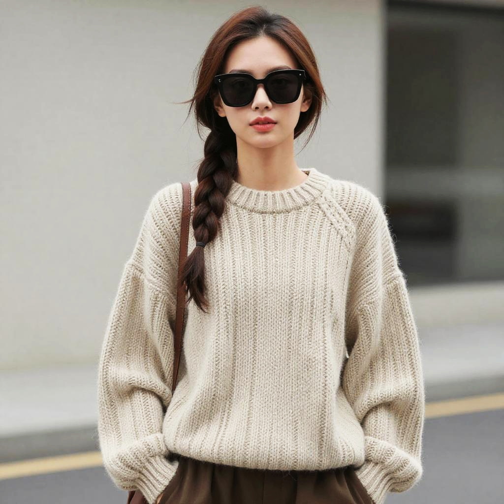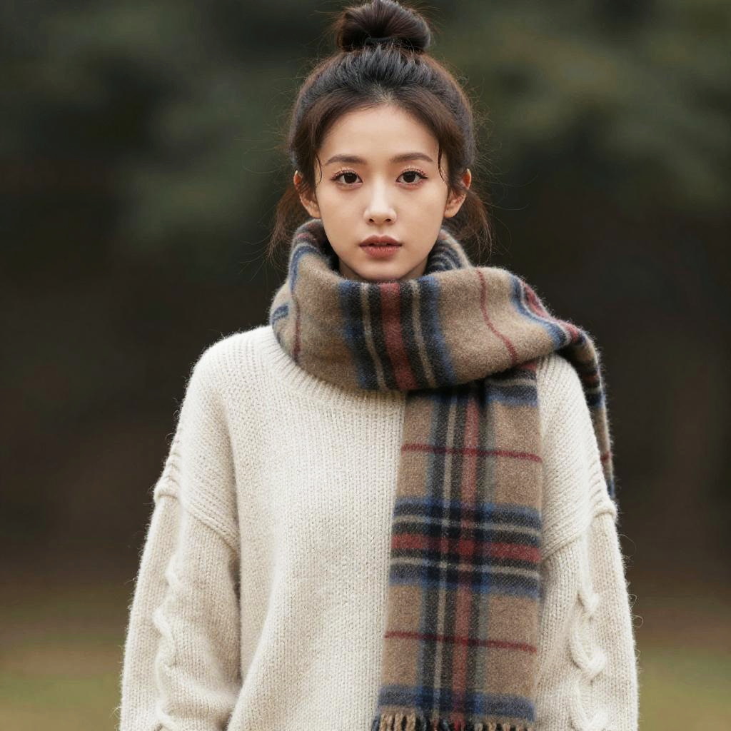 Portrait of an Asian woman wearing a cream chunky knit sweater and a brown plaid wool scarf. She has her hair styled in a top knot and is looking directly at the camera with a neutral expression. The background is blurred, emphasizing the subject.